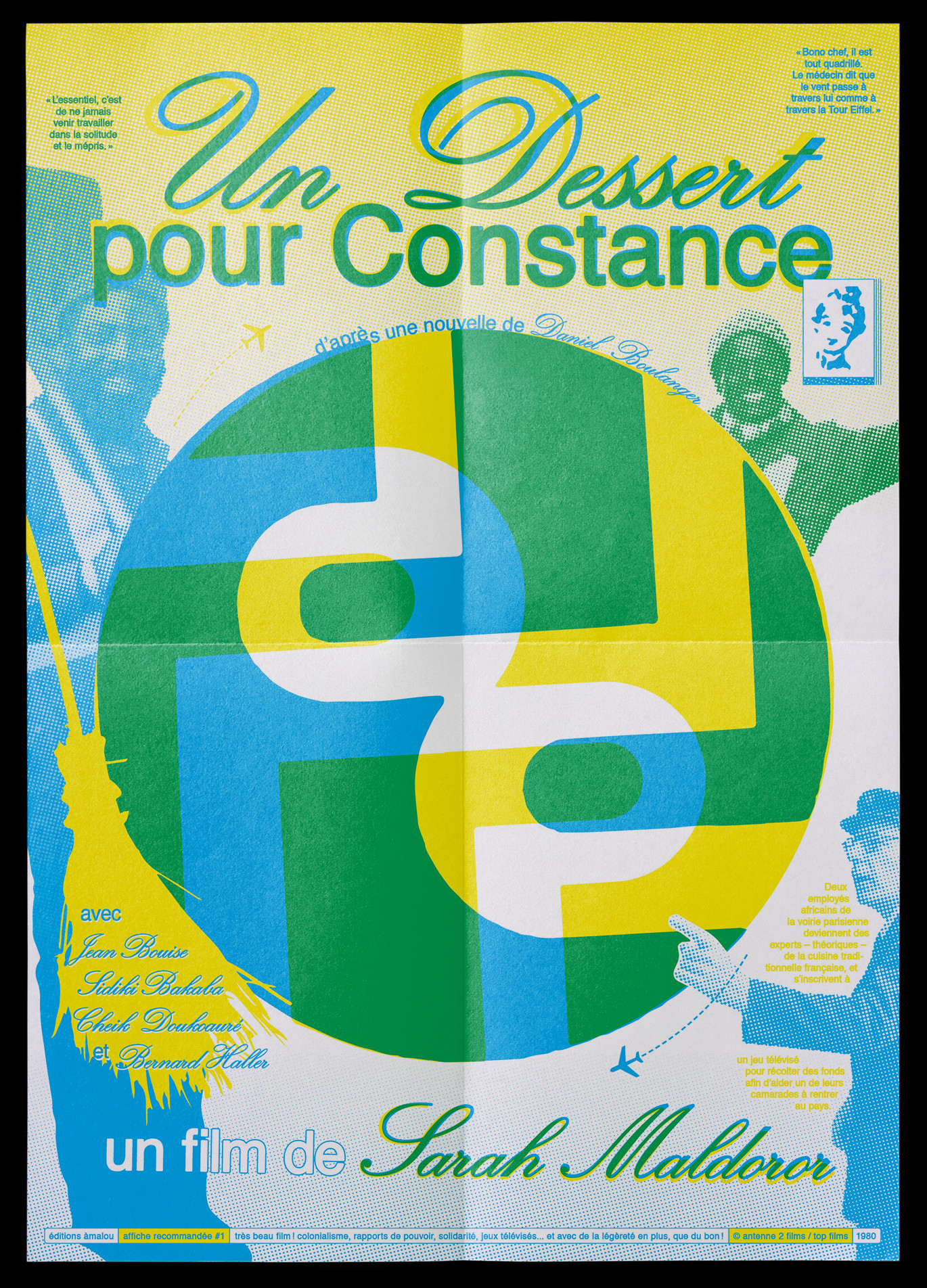 Dans le cadre des affiches recommandées, une collection éditée par les éditions àmalou, je réalise des affiches pour des films que je recommande vivement. Celle-ci est pour Un Dessert pour Constance, réalisé par Sarah Maldoror. L'esprit ludique du film a inspiré la conception de l'affiche, qui revisite le logo des services de nettoyage parisiens. Un feuillet accompagnant l'affiche contient la traduction anglaise des citations utilisées ainsi que des clefs de lecture.