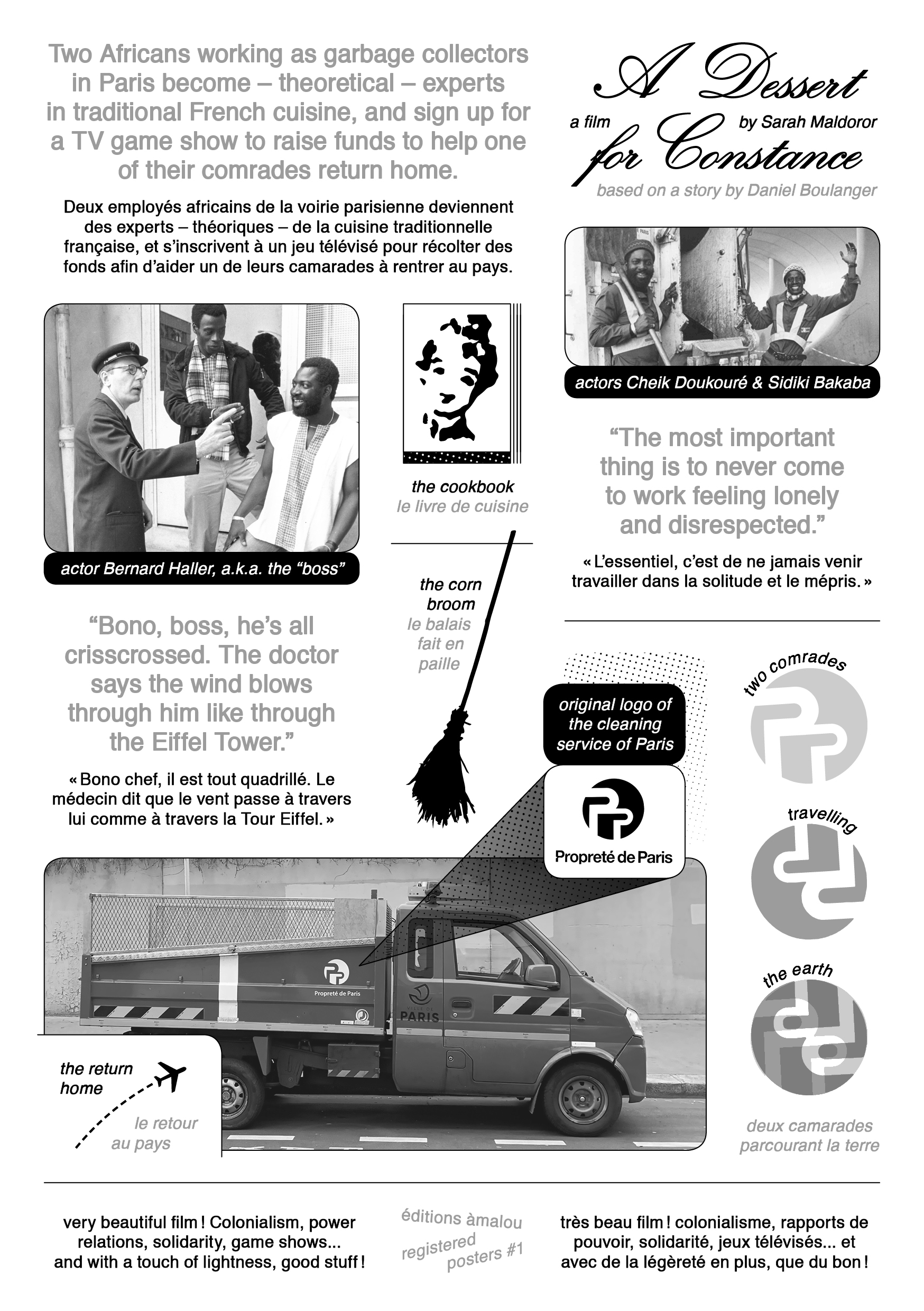 As part of the registered posters series edited by éditions àmalou, I design posters for films I highly recommend. This one is for Un Dessert pour Constance, directed by Sarah Maldoror. The playfulness of the film inspired the poster's design, featuring a rework of the Paris public cleaning service's logo. An additional leaflet provides English translations of the quotes used in the poster, as well as insight into the overall design.