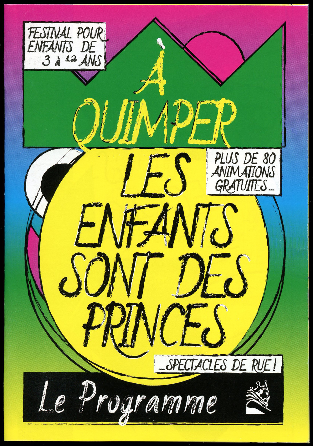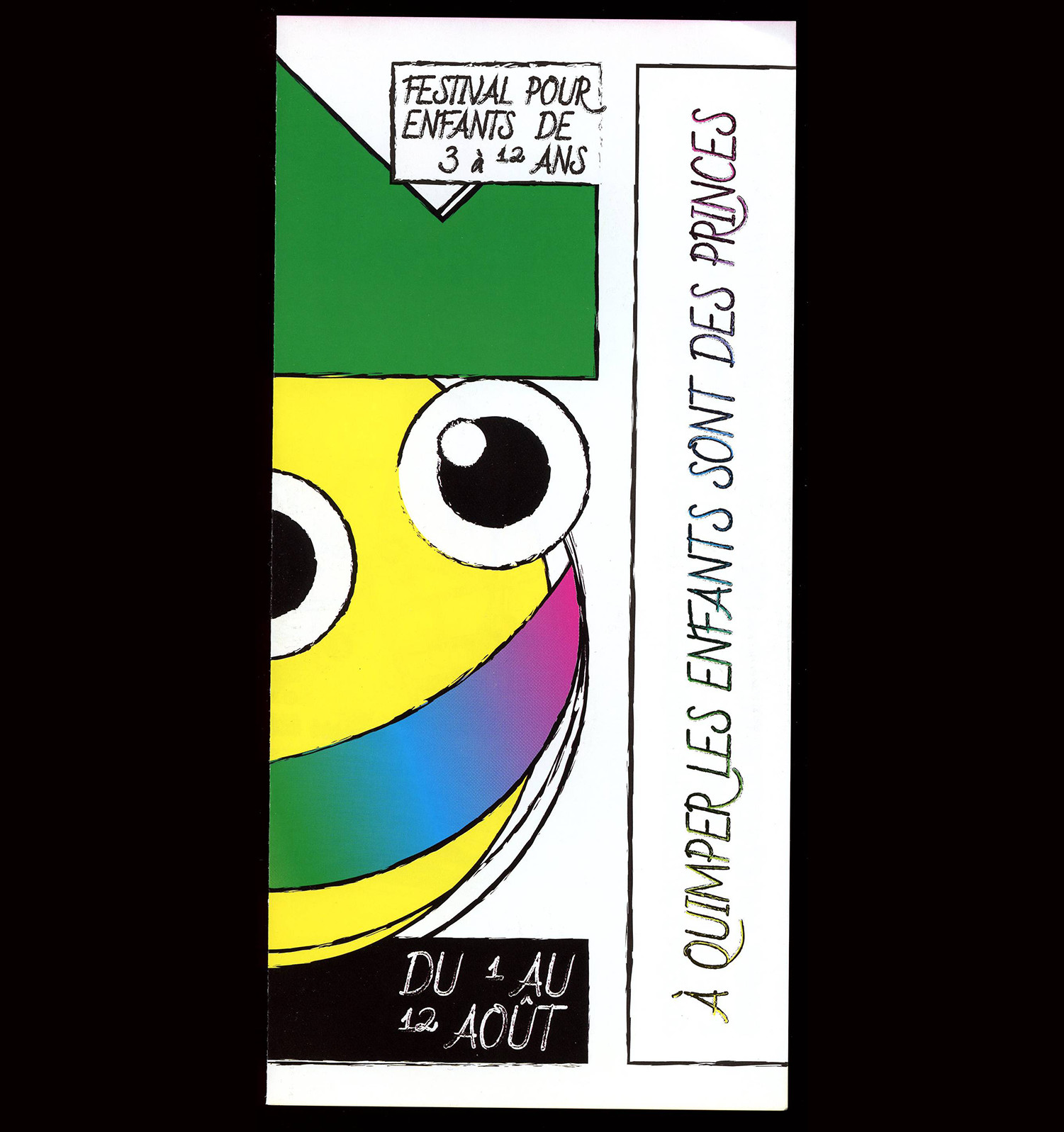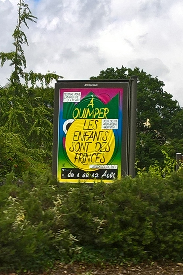 Les Enfants sont des Princes (Kids are Princes) is a performing arts festival for kids taking place in Quimper (FR). For this third edition, I designed the identity of the festival based on a two-sided mascotte. The posters outside of the city featured the back of the mascot with practical information, while the posters inside the city revealed the face of the mascot.
