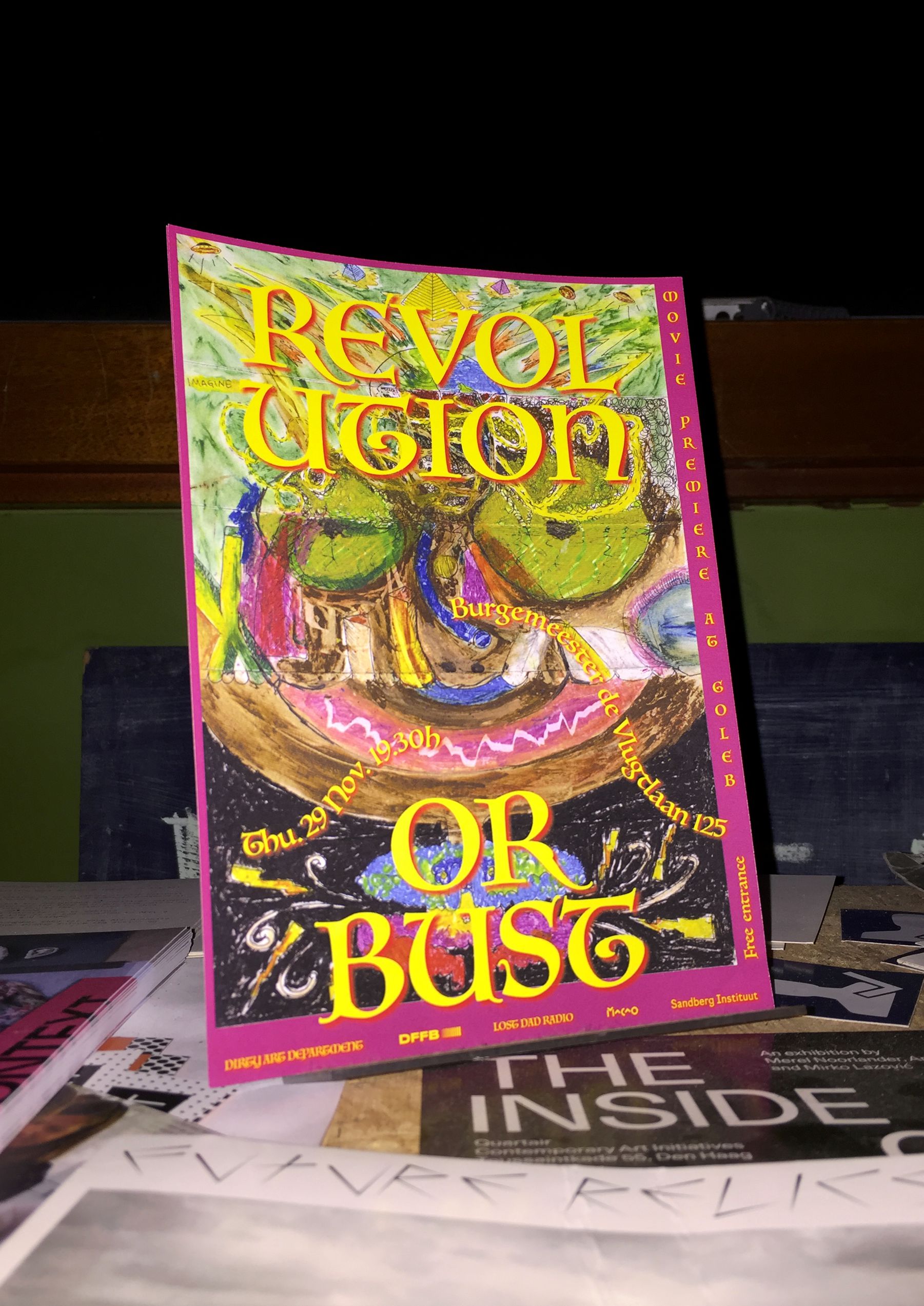 Poster réalisé pour la projection du film collectif « Revolution or Bust ». Le dessin a été réalisé en deux étapes : d'abord selon la méthode du cadavre exquis, puis en le coloriant collectivement une fois déplié.