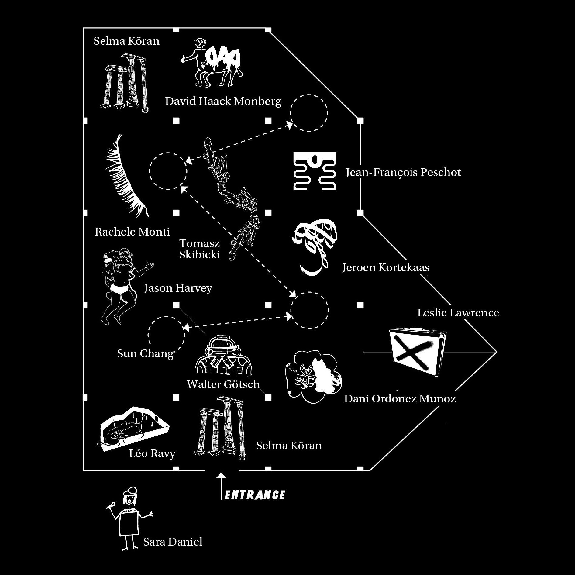 Réalisé pour une exposition collective regroupant des artistes et des designers, la commande consistait à réaliser une identité visuelle capable de représenter l'ensemble des participant·e·s, mais aussi de servir de support de médiation durant les visites guidées. Pour ce faire, j'ai demandé aux participant·e·s une image représentative de leur travail (dessin, photo, esquisse) afin de pouvoir l'utiliser pour composer l'affiche. En collaboration avec les commissaires de l'exposition, ces images ont ensuite été séparées en deux blocs, chacun associé à une partie du titre.