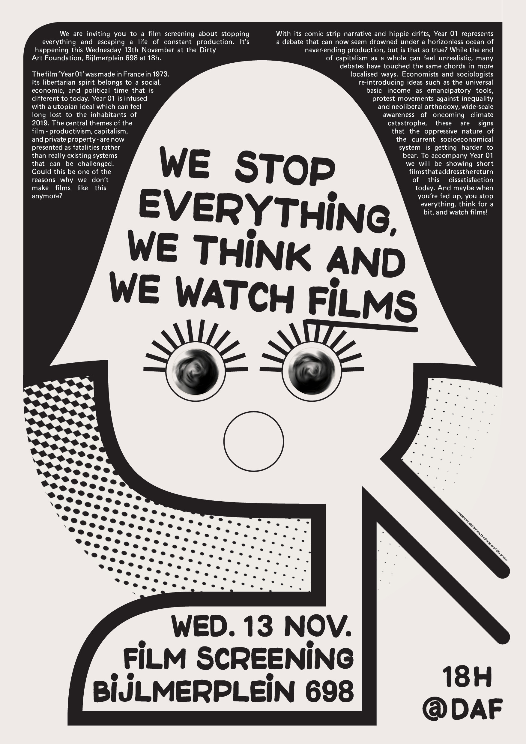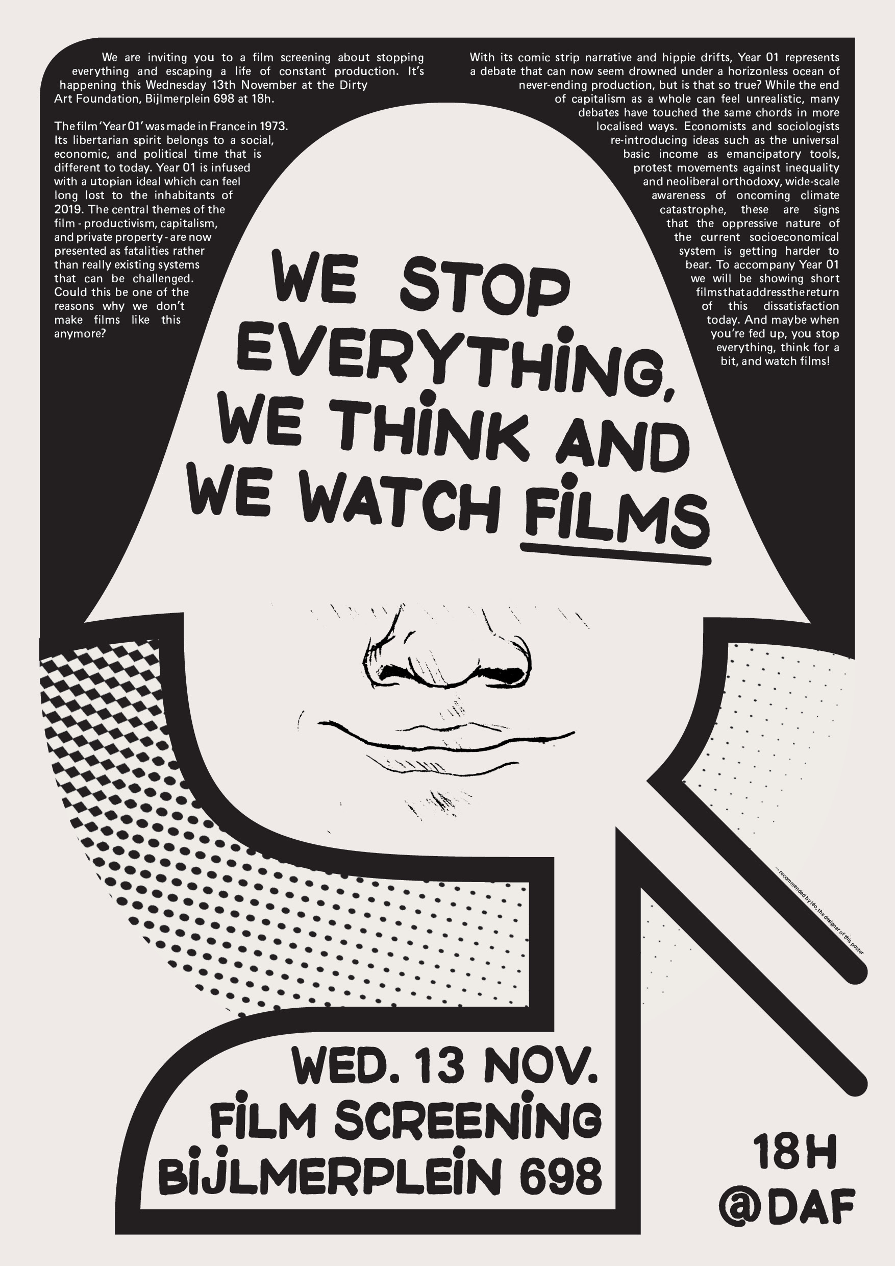Poster réalisé pour annoncer la projection d'une sélection de films par le ciné-club « Kinoclub Fallow ». L'illustration principale est une référence directe à la bande dessinée « L'an 01 », dont l'adaptation cinématographique occupe une place centrale dans la sélection du ciné-club, et les différents visages ont été dessinés par ses 3 organisateurs.
