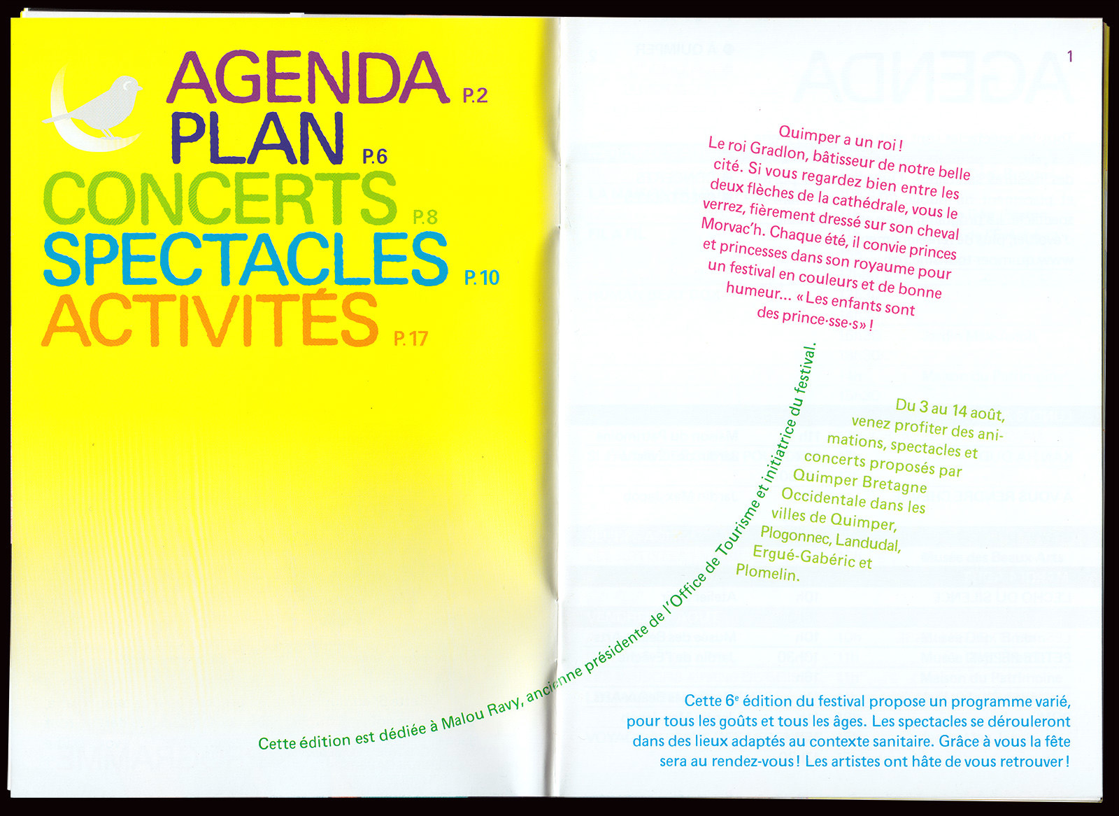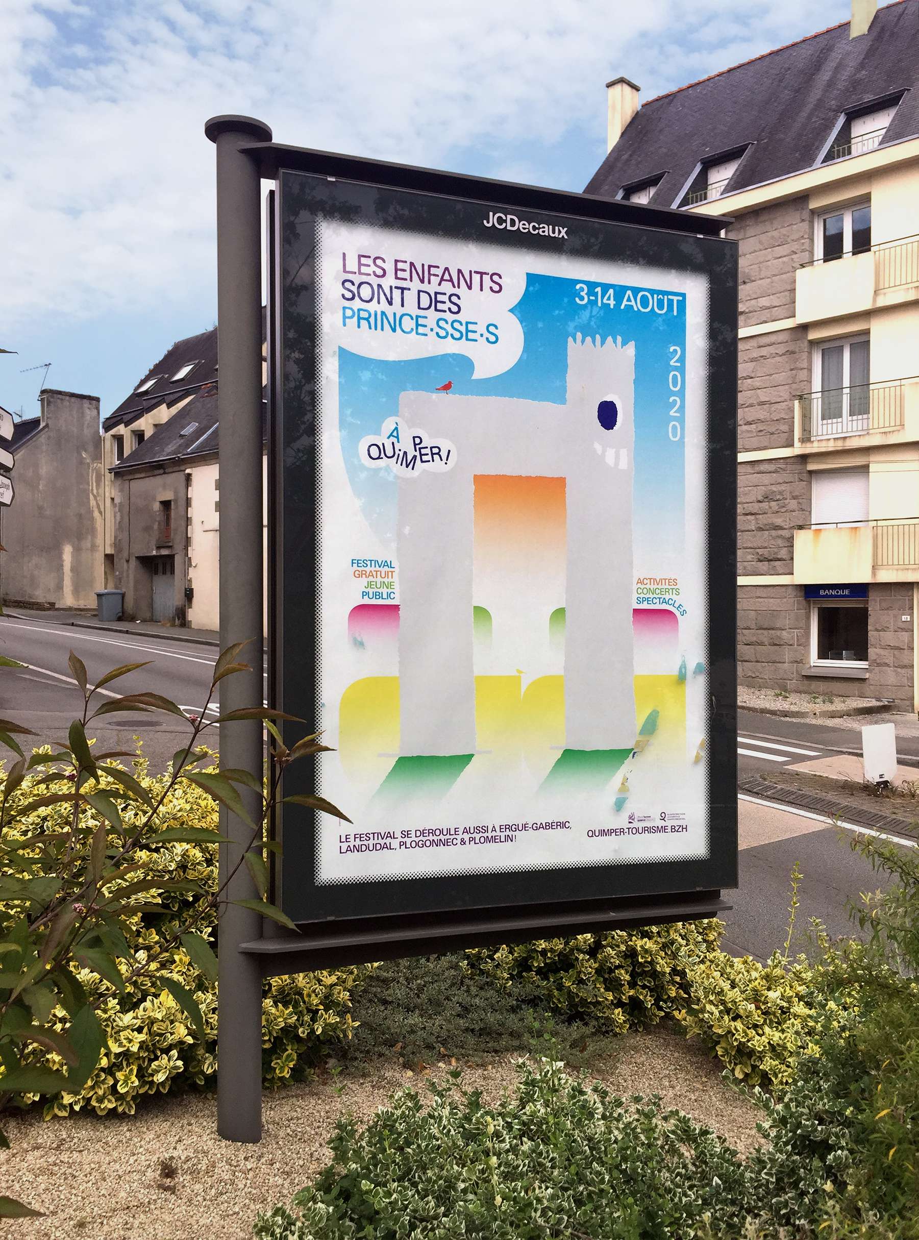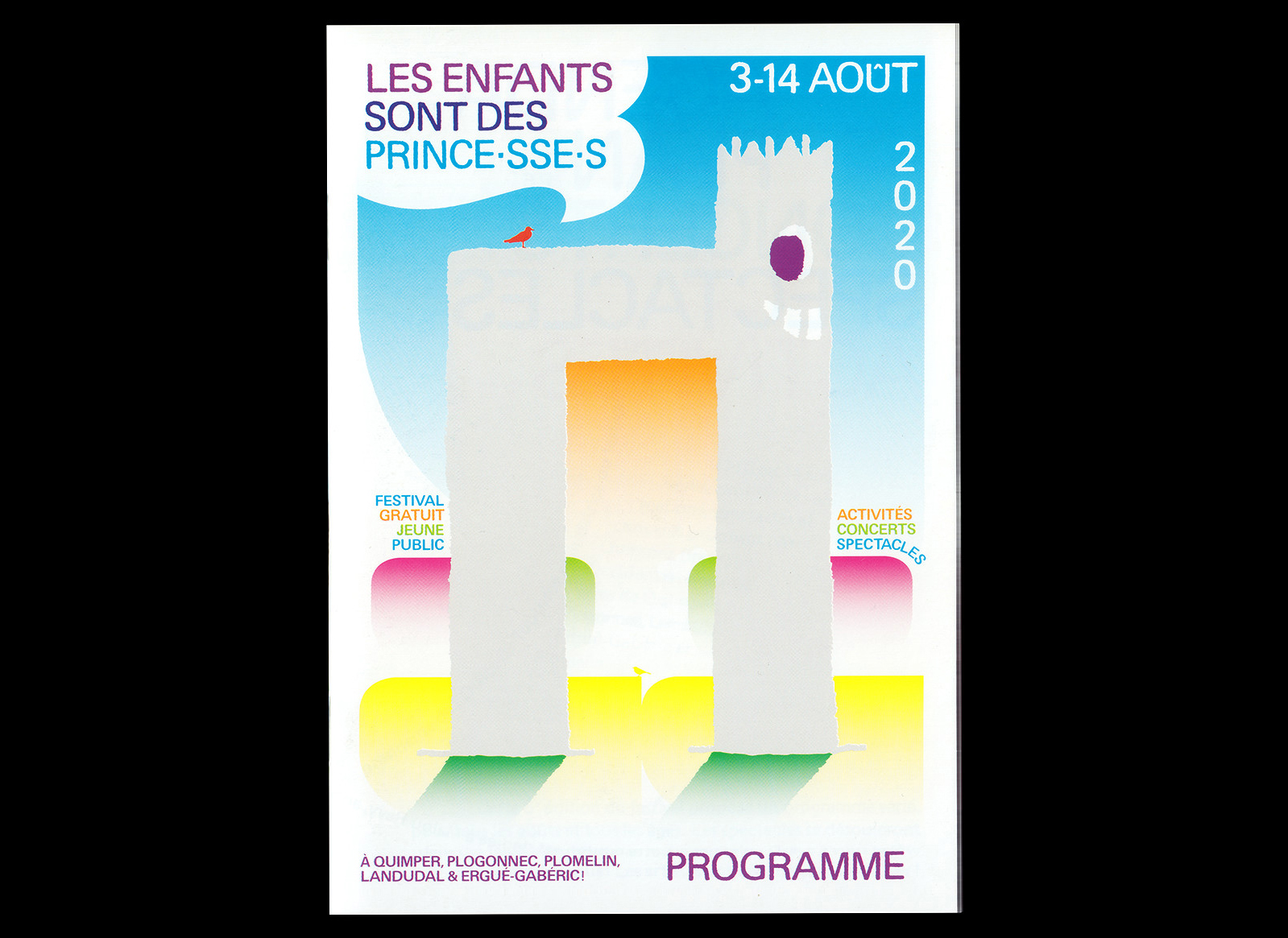 Les Enfants sont des Princes (Kids are Princes) is a performing arts festival for kids taking place in Quimper (FR). For this sixth edition, which took place during the COVID-19 pandemic, I designed the festival's identity based on a mischievous but reassuring mascot (inspired by a drawing from my childhood) and local birds (whose presence had greatly increased in Quimper during the pandemic). A flower was also added in order to pay tribute to the festival's creator, Malou Ravy, who had passed away a few months earlier.