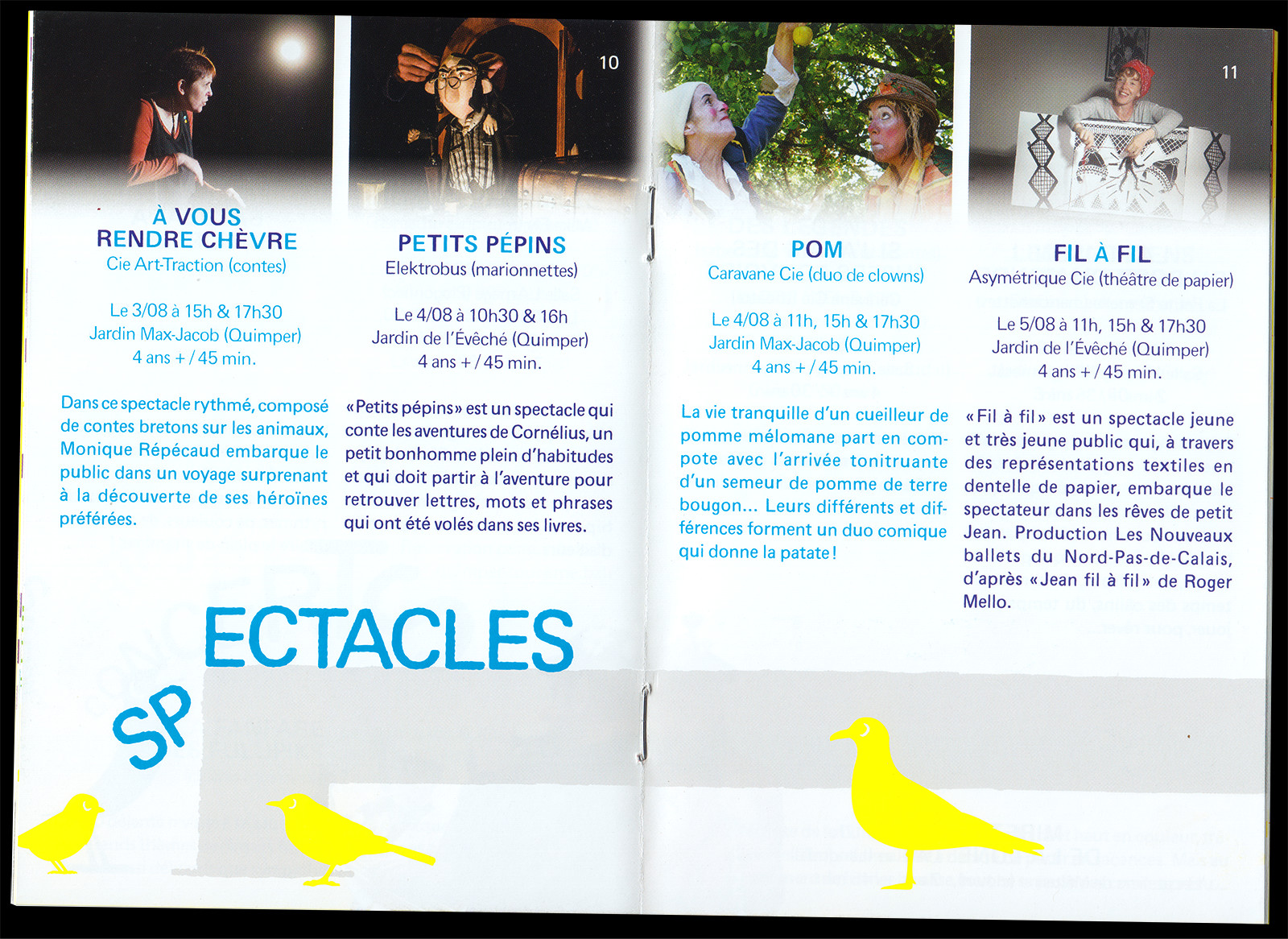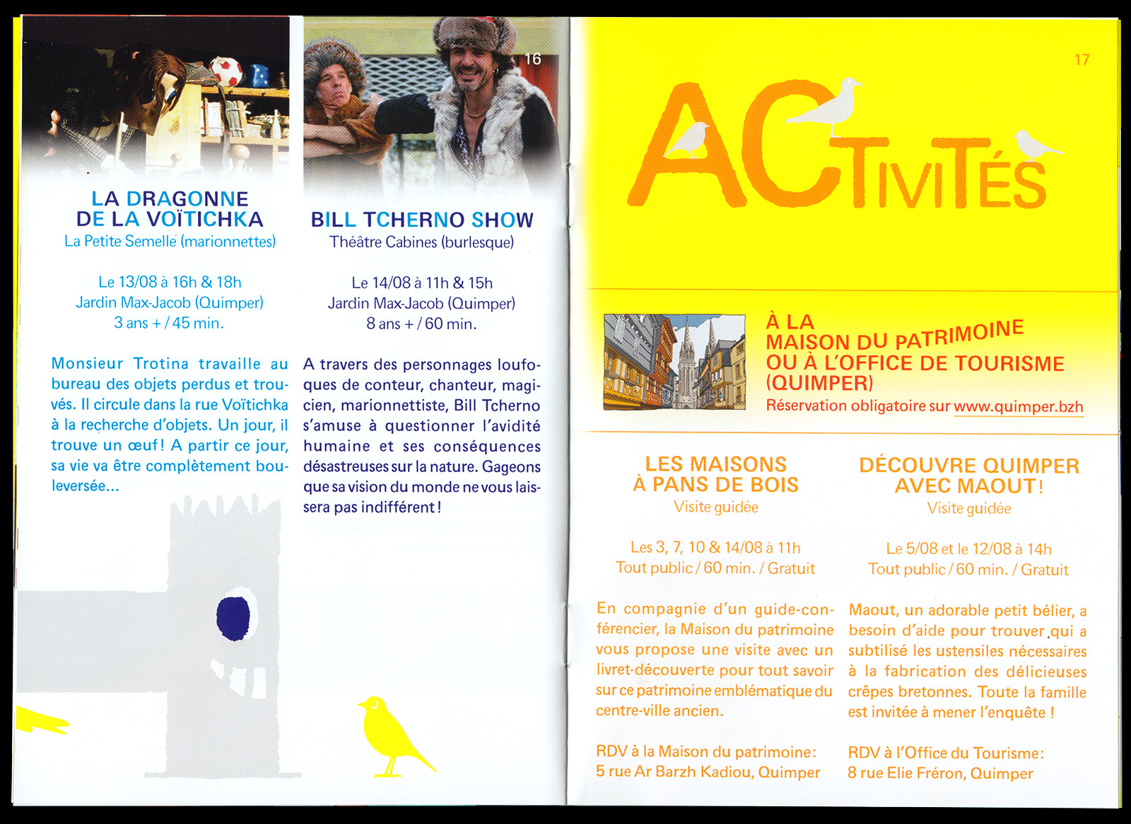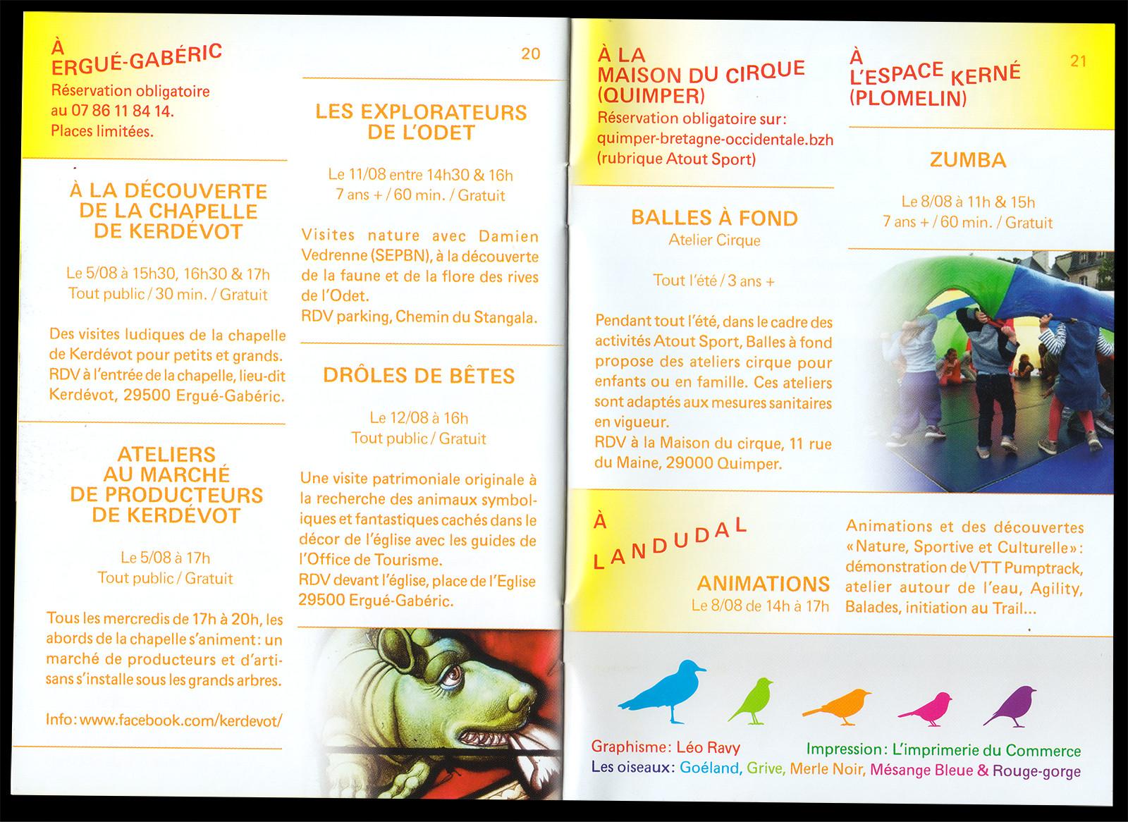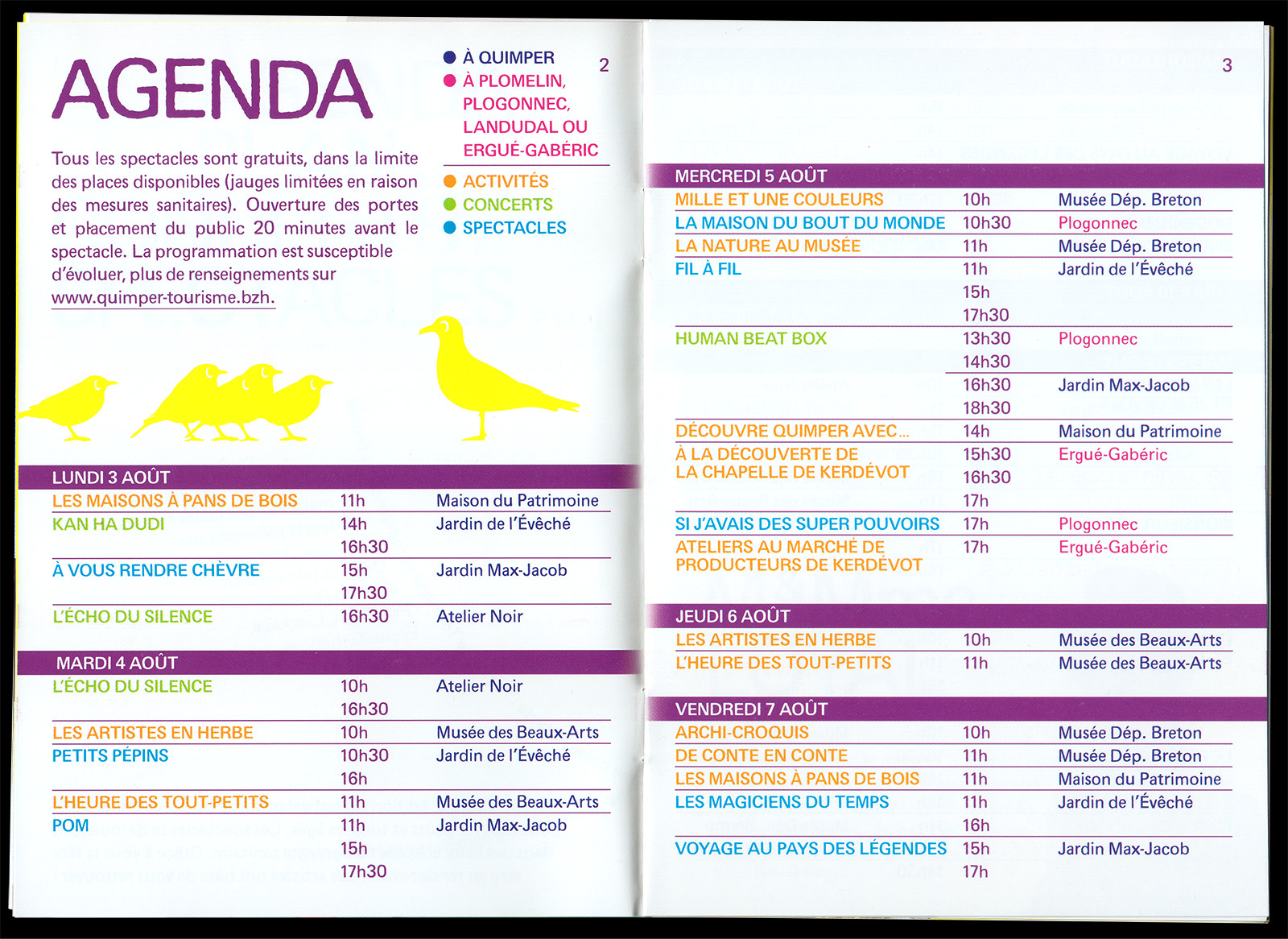 Les Enfants sont des Princes (Kids are Princes) is a performing arts festival for kids taking place in Quimper (FR). For this sixth edition, which took place during the COVID-19 pandemic, I designed the festival's identity based on a mischievous but reassuring mascot (inspired by a drawing from my childhood) and local birds (whose presence had greatly increased in Quimper during the pandemic). A flower was also added in order to pay tribute to the festival's creator, Malou Ravy, who had passed away a few months earlier.