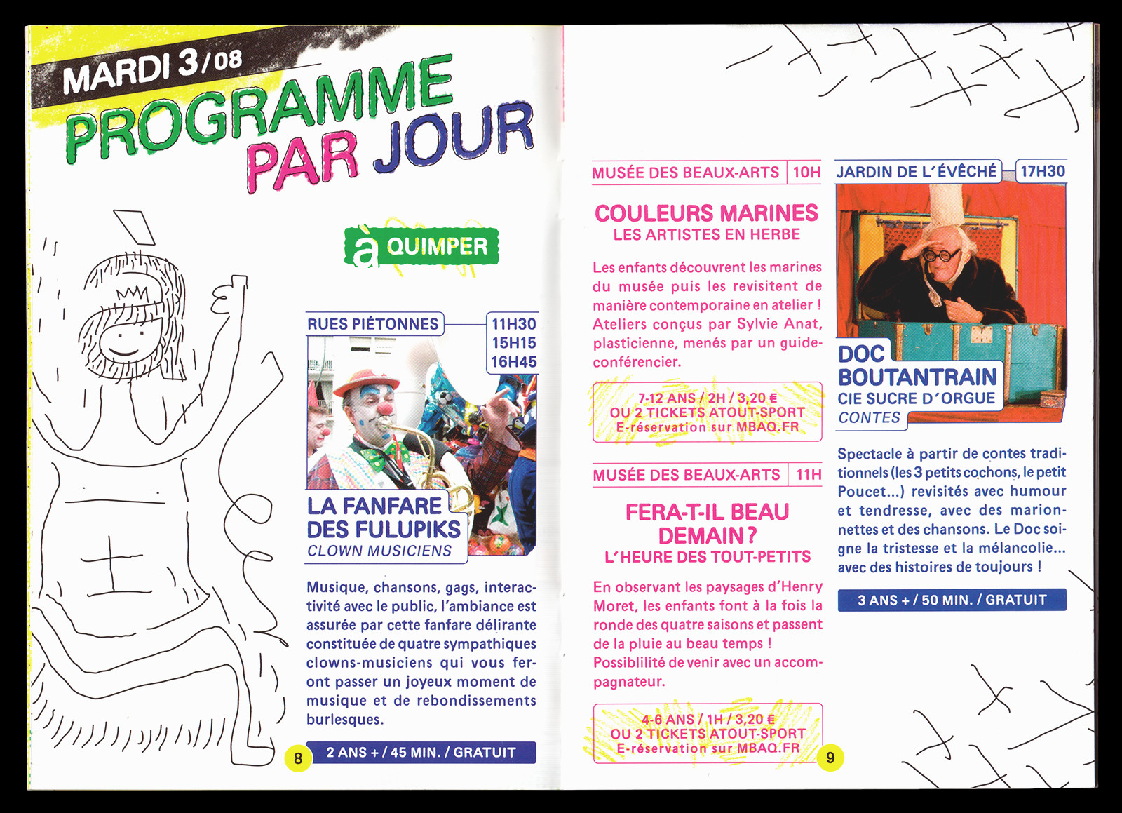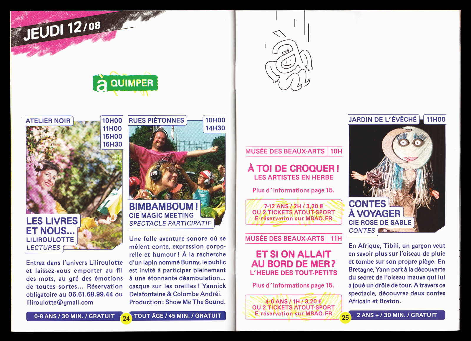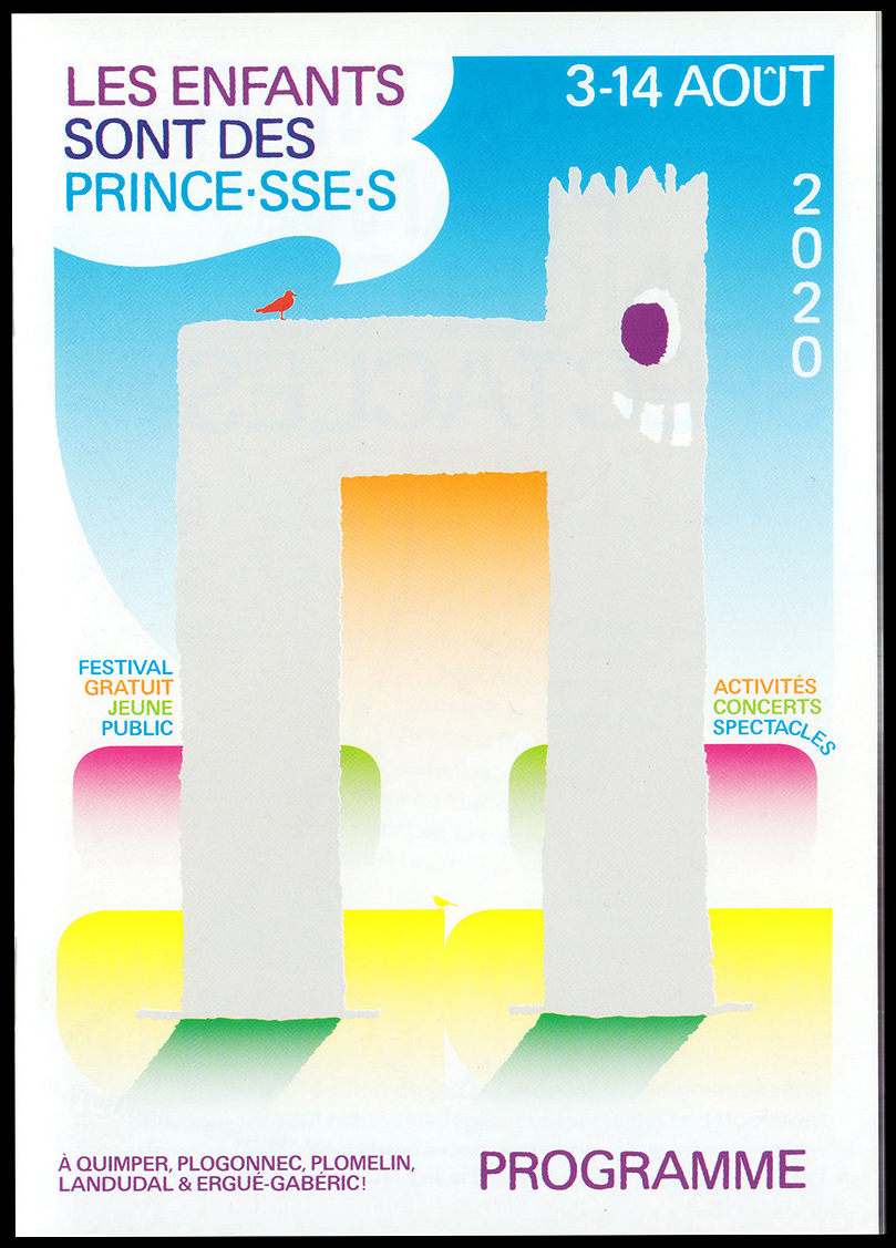 Les Enfants sont des Princes (Kids are Princes) is a performing arts festival for kids taking place in Quimper (FR). For this final iteration of it's historically ever-changing identity, i crafted a series of visuals blending all 6 previous mascottes of the festival together in a style inspired by stacked characters posters and coloring books.
