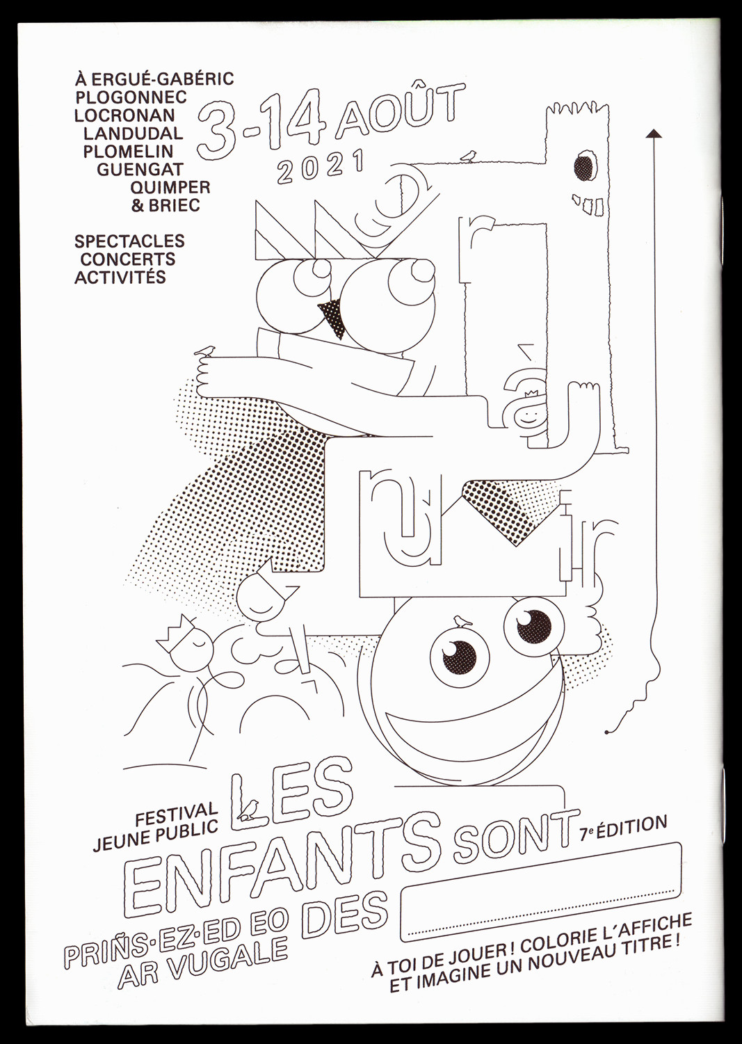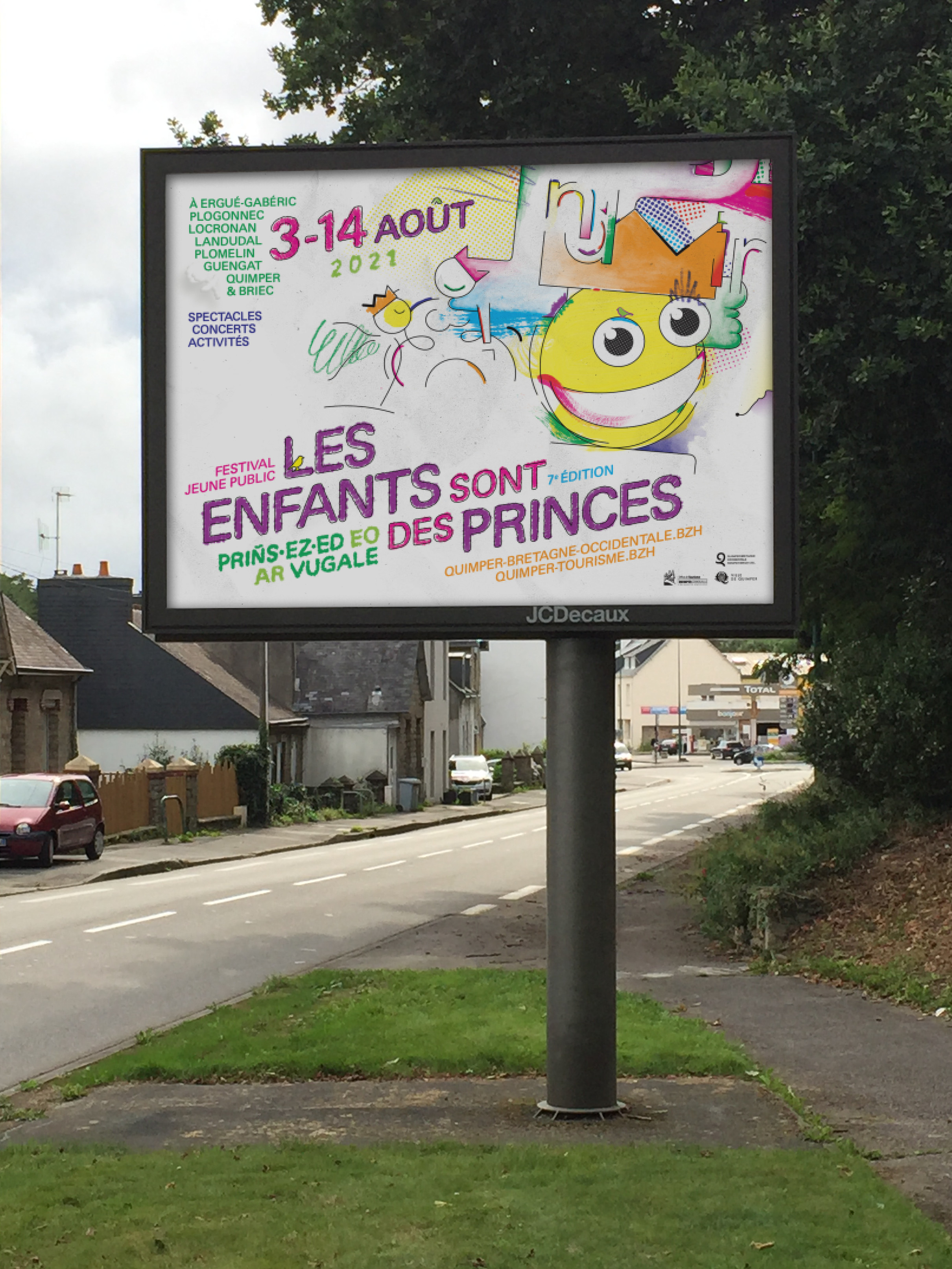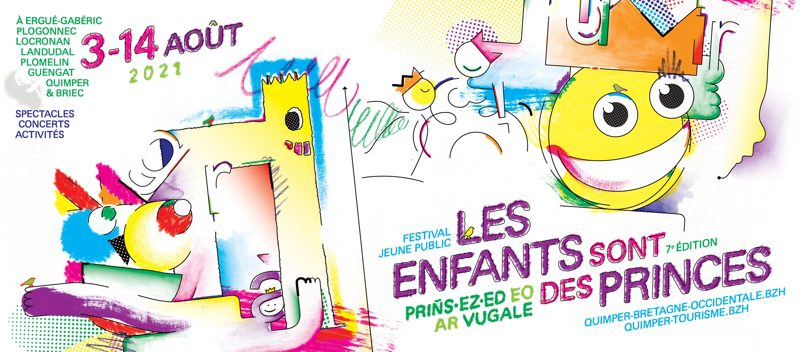 Les Enfants sont des Princes est un festival d'arts du spectacle pour enfants qui se déroule à Quimper (FR). Pour ce dernier volet de son identité qui fût historiquement en constante évolution, j'ai conçu une série de visuels mêlant les 6 mascottes précédentes du festival dans un style inspiré des posters de personnages empilés et des livres de coloriage.