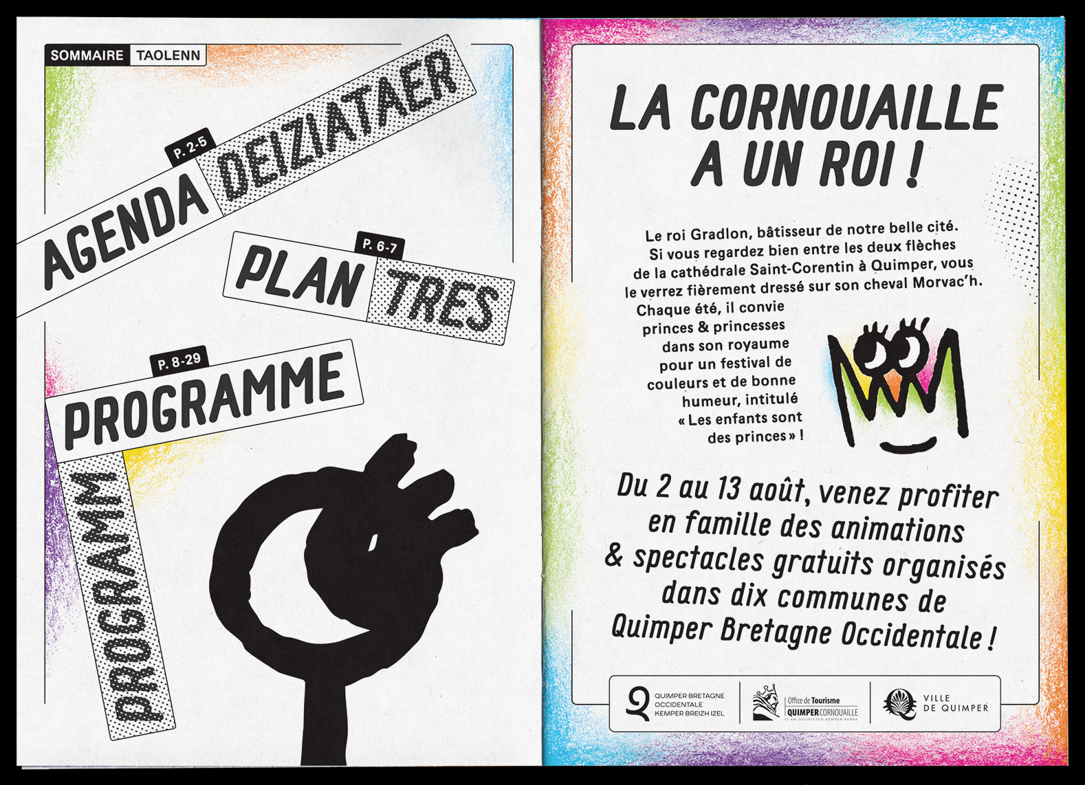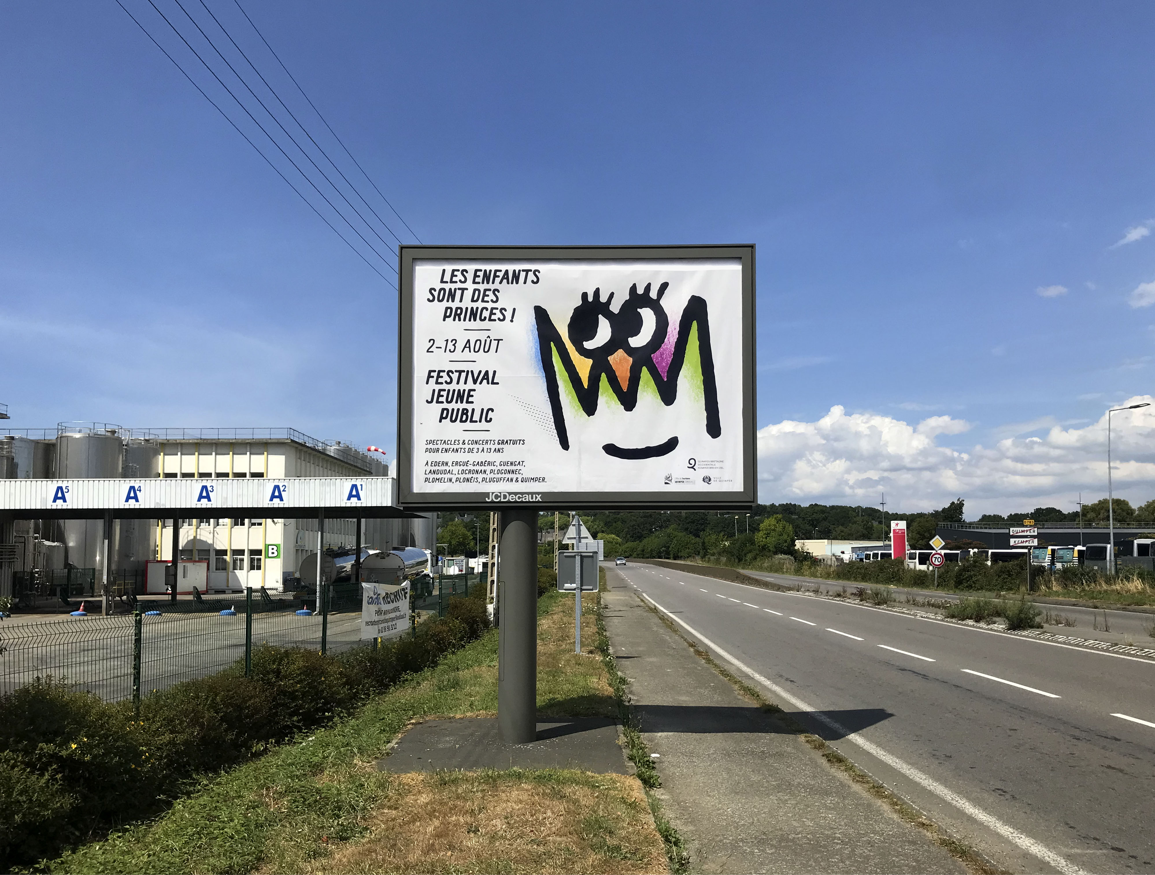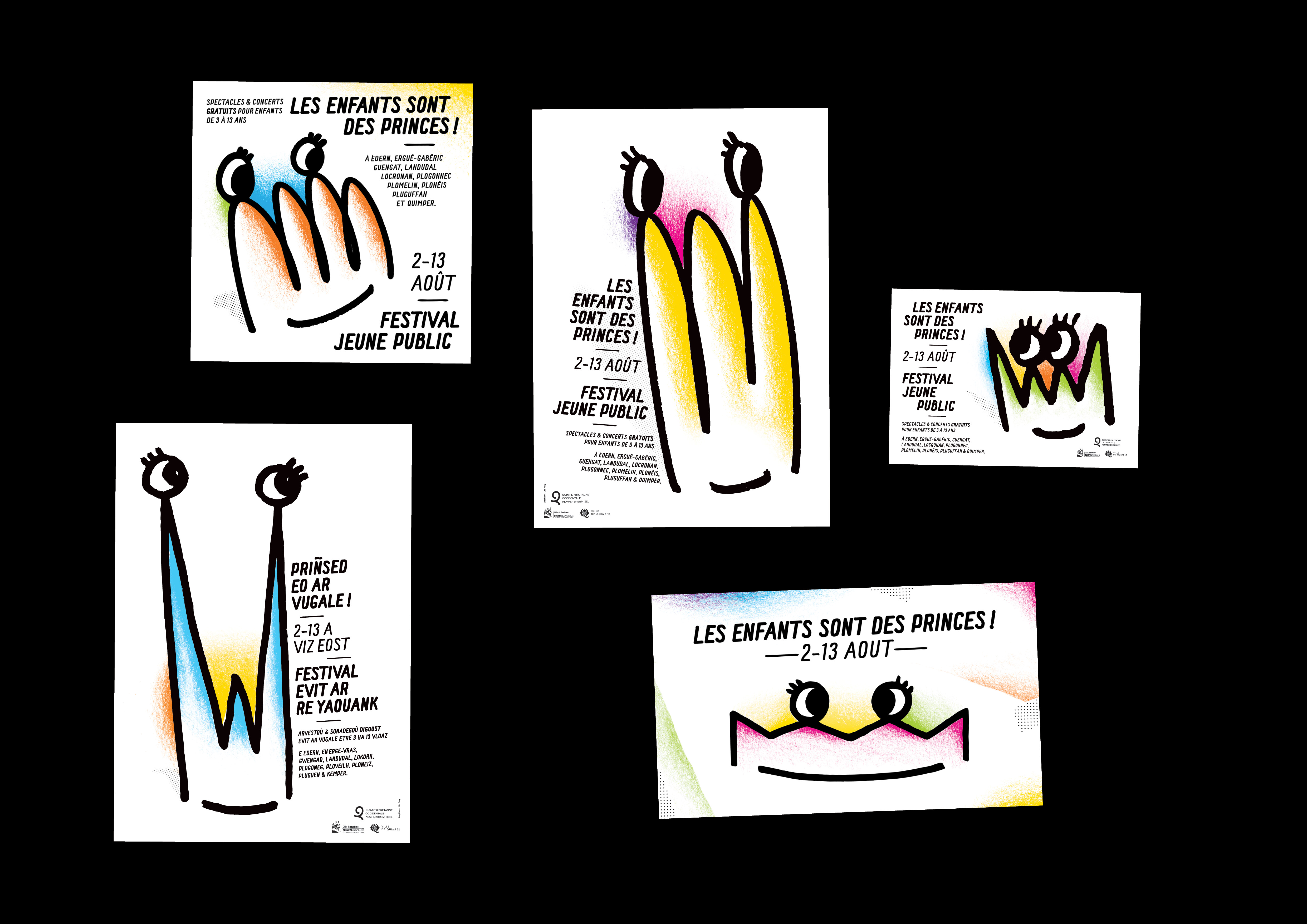 Les Enfants sont des Princes (Kids are Princes) is a performing arts festival for kids taking place in Quimper (FR). For this first iteration of it's new identity, I made a series of 5 easily identifiable mascots by playing with the different shapes crowns can take.