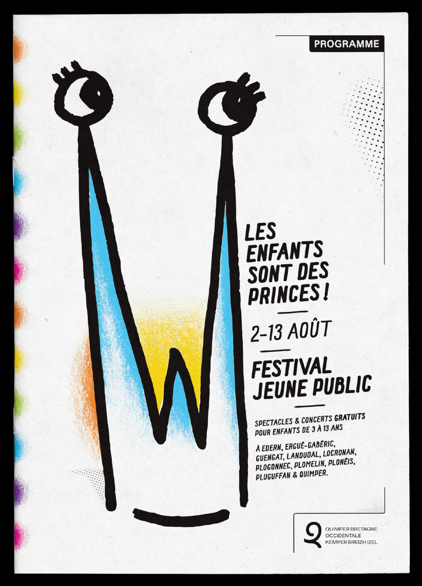 Les Enfants sont des Princes est un festival d'arts du spectacle pour enfants qui se déroule à Quimper (FR). Pour ce premier volet de sa nouvelle identité, j'ai réalisé une série de 5 mascottes facilement identifiables en jouant avec les différentes formes que peuvent prendre les couronnes.