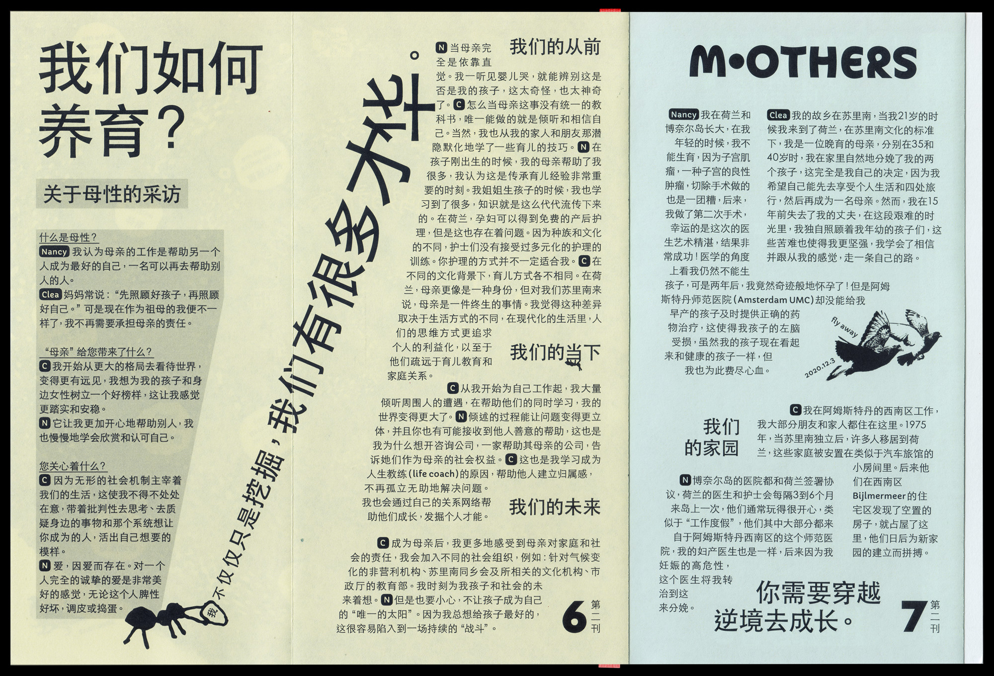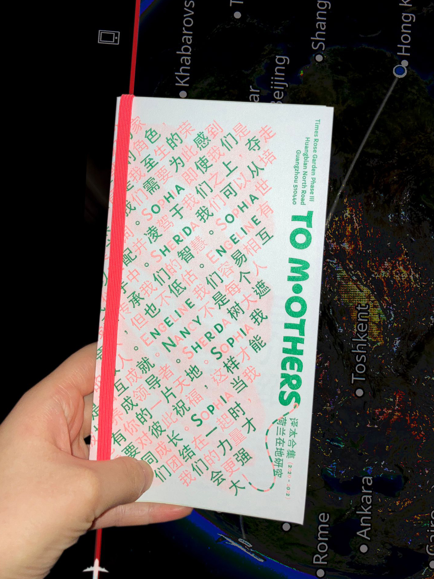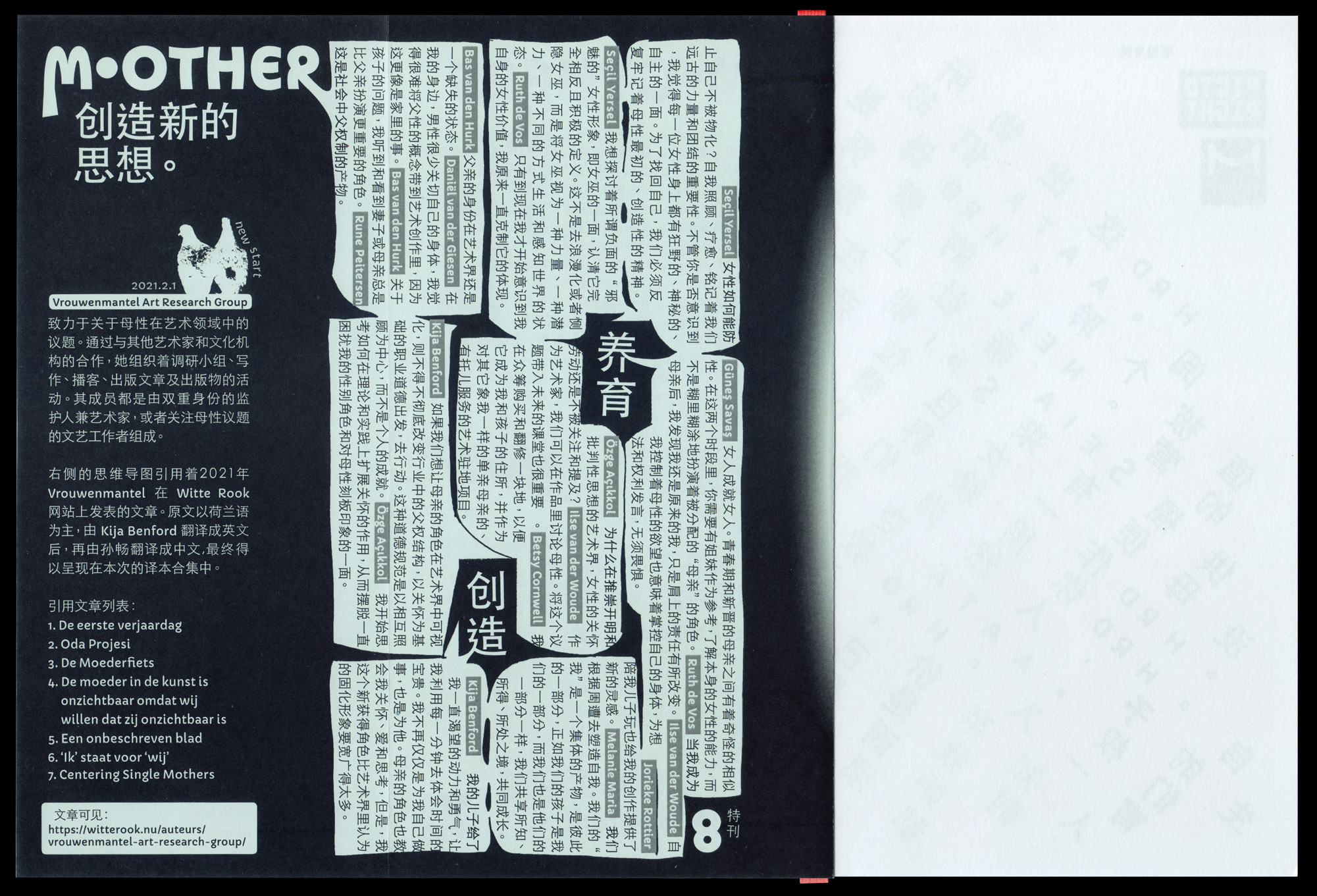 Ce zine présente la majorité des contenus des deux premières éditions de To M•Others, et de son édition spéciale réalisée avec Vrouwenmantel Art Research Group, traduits en chinois. Composé de deux feuilles, un système de pliage permet de faire dialoguer les éditions entre-elles. Réalisé pour la résidence de l'artiste Sun Chang au Times Museum, Guangzhou (CN).
