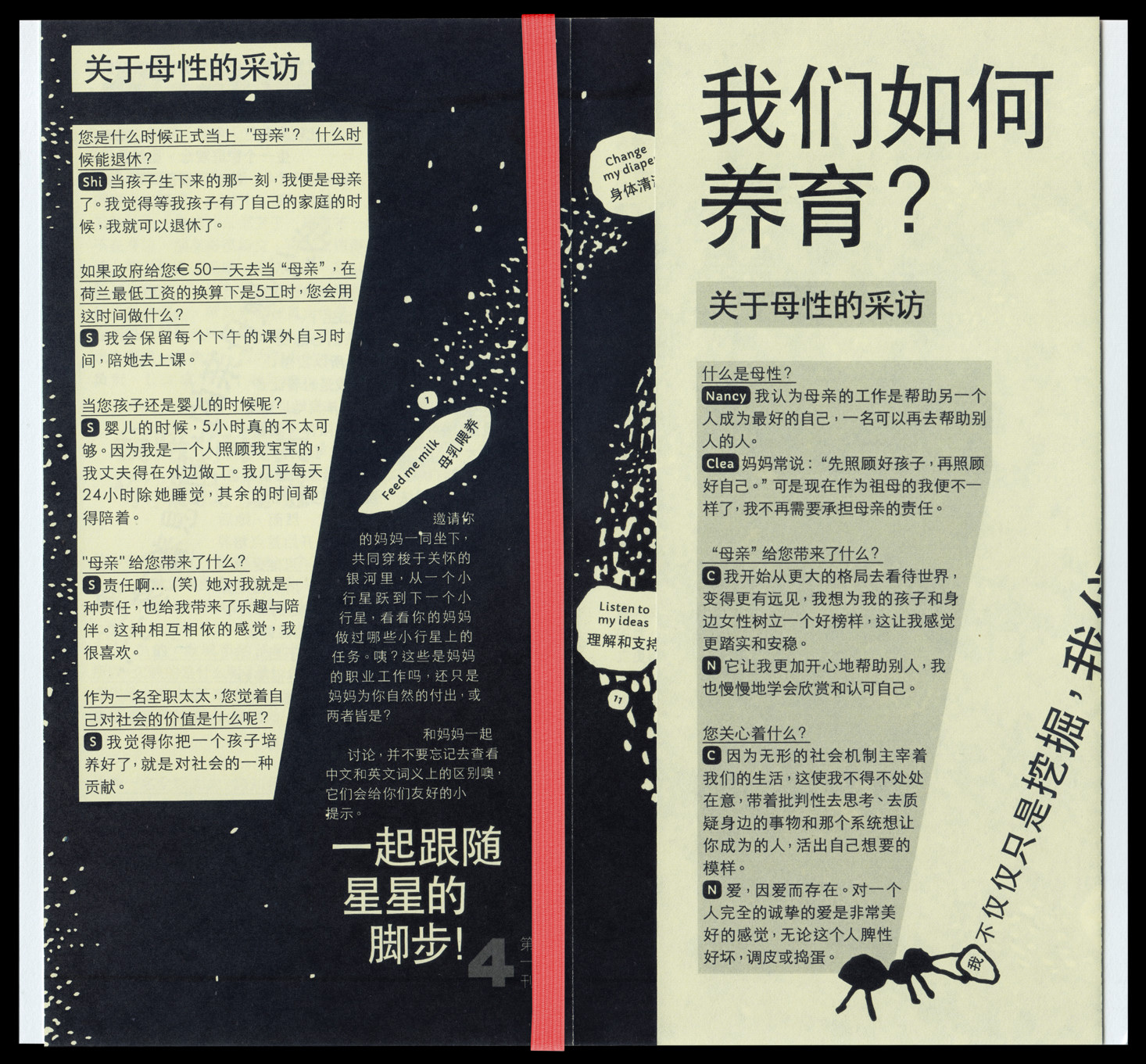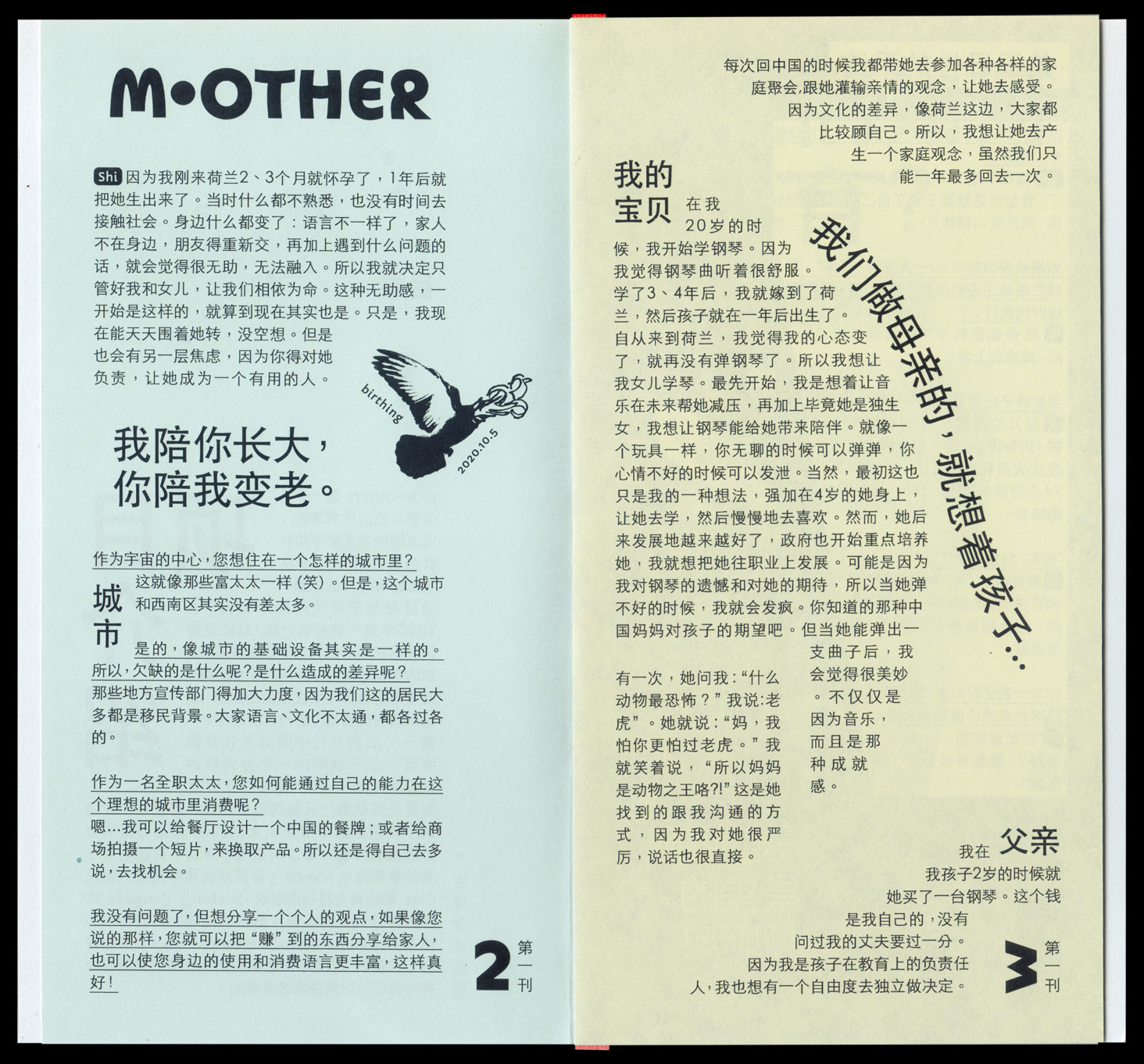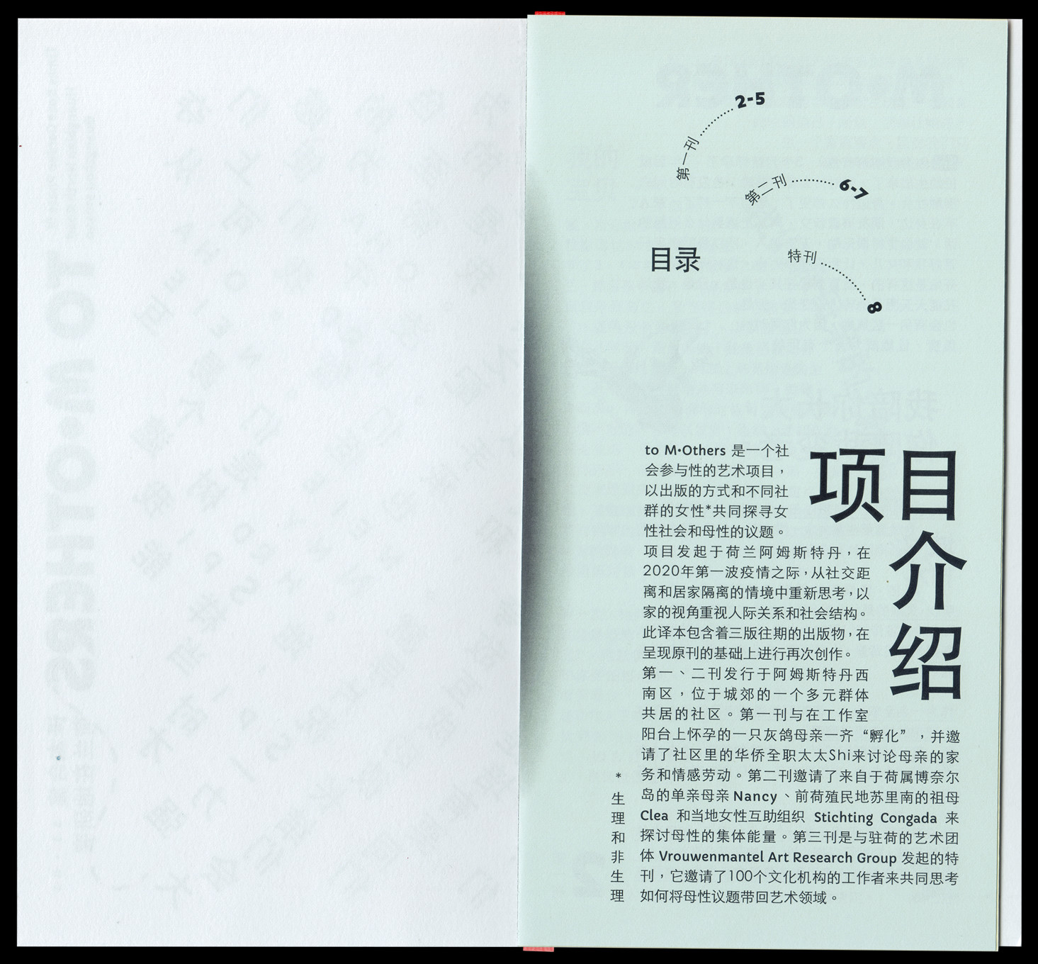 Ce zine présente la majorité des contenus des deux premières éditions de To M•Others, et de son édition spéciale réalisée avec Vrouwenmantel Art Research Group, traduits en chinois. Composé de deux feuilles, un système de pliage permet de faire dialoguer les éditions entre-elles. Réalisé pour la résidence de l'artiste Sun Chang au Times Museum, Guangzhou (CN).