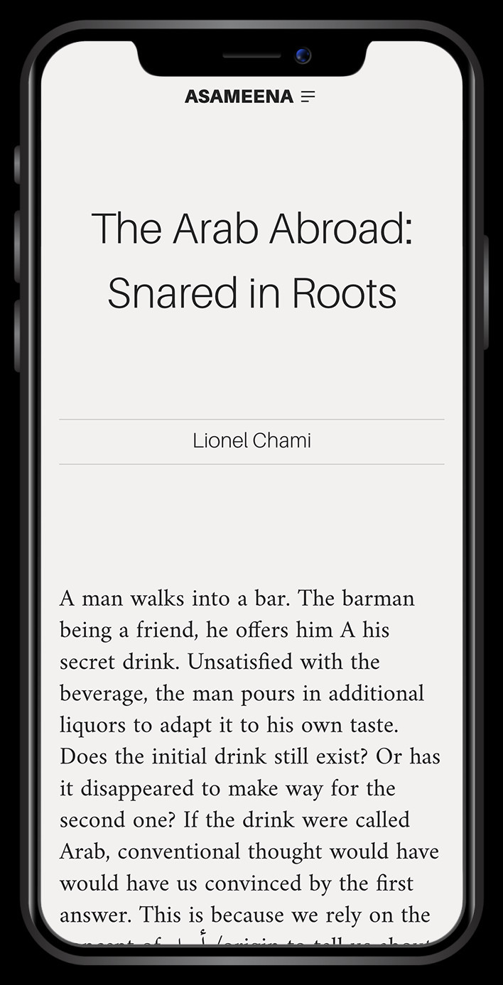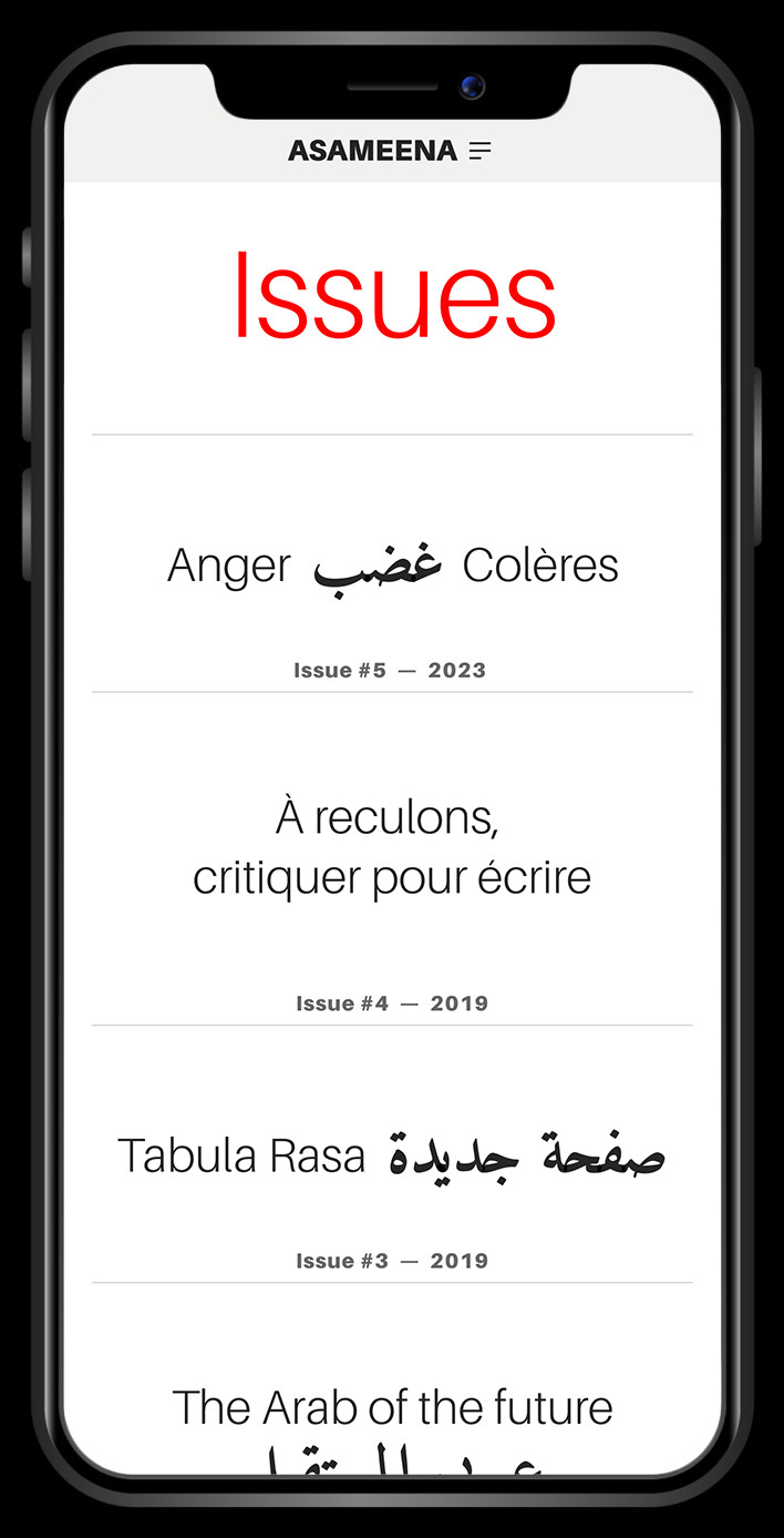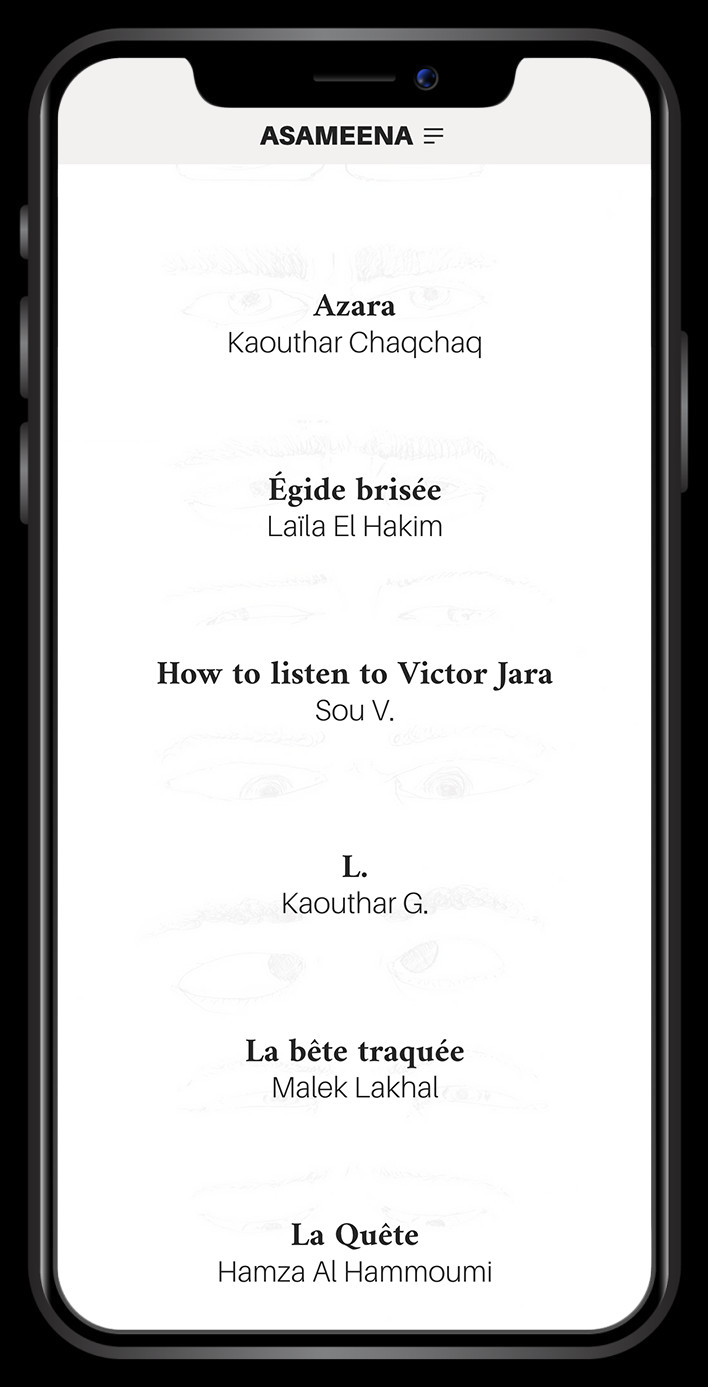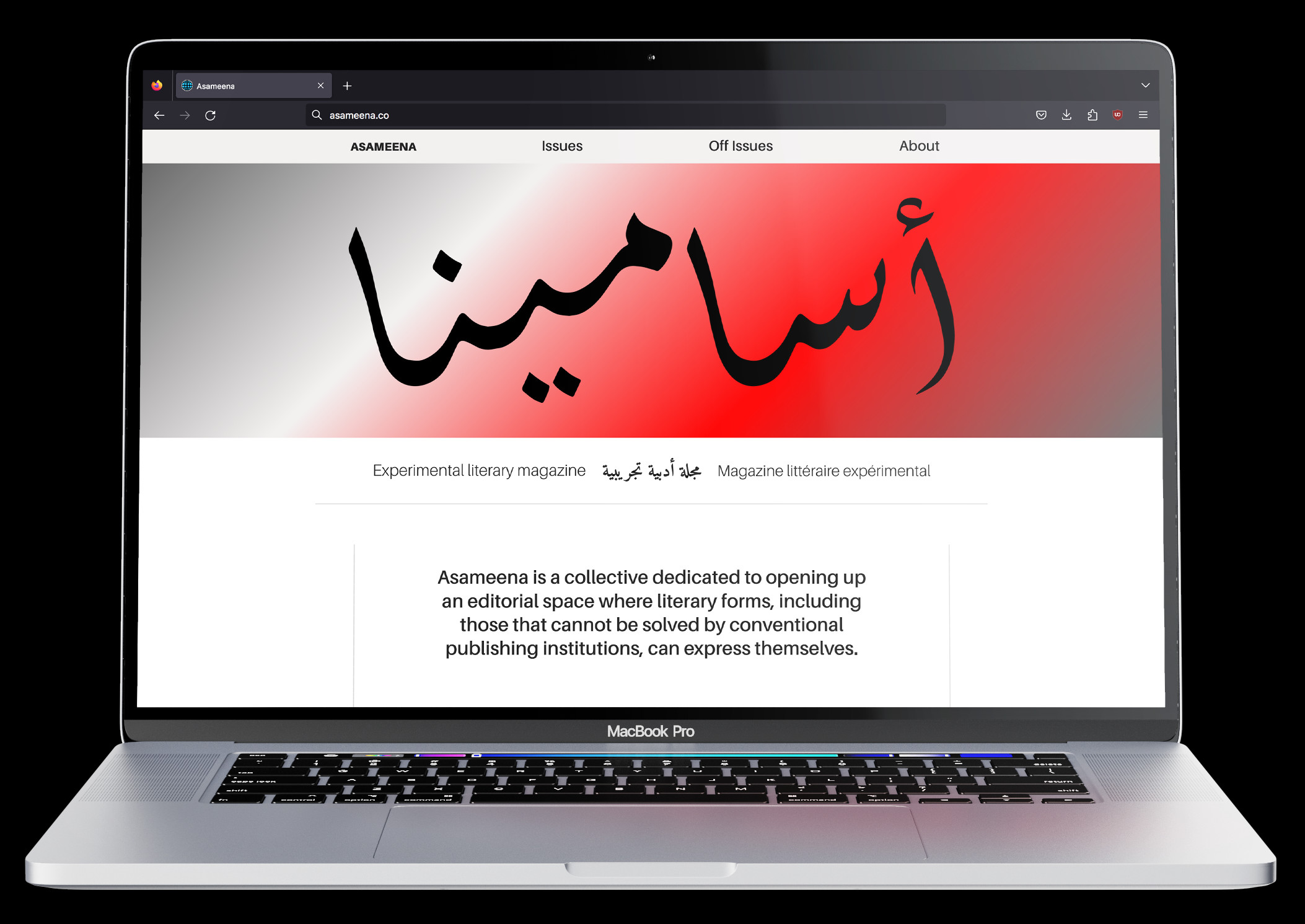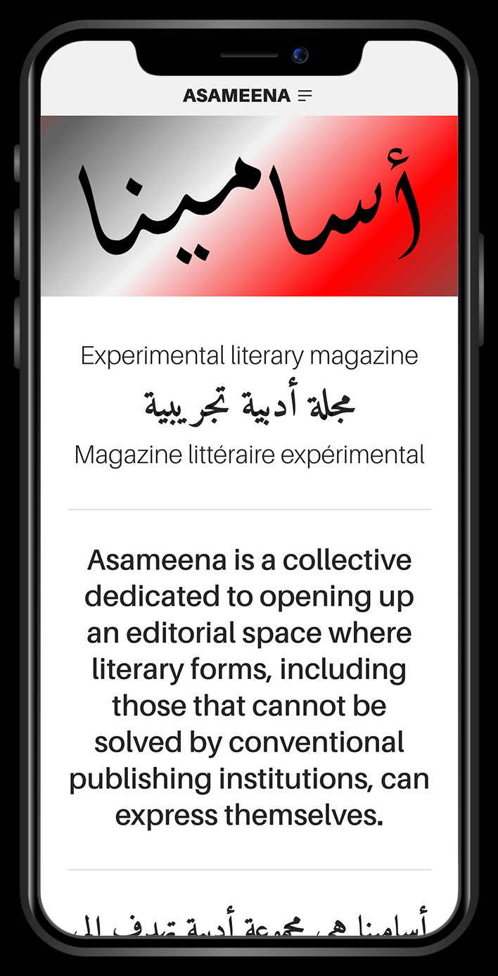 Asameena est un collectif dont la vocation est de travailler à ouvrir un espace éditorial où des formes littéraires, parmi lesquelles des formes non-solvables dans les institutions éditoriales classiques, peuvent s’exprimer. Ce site internet sert de liseuse pour l'ensemble des articles publiés par le collectif.