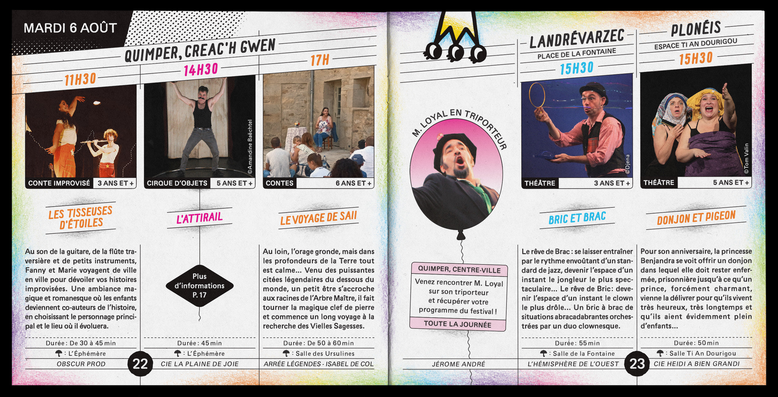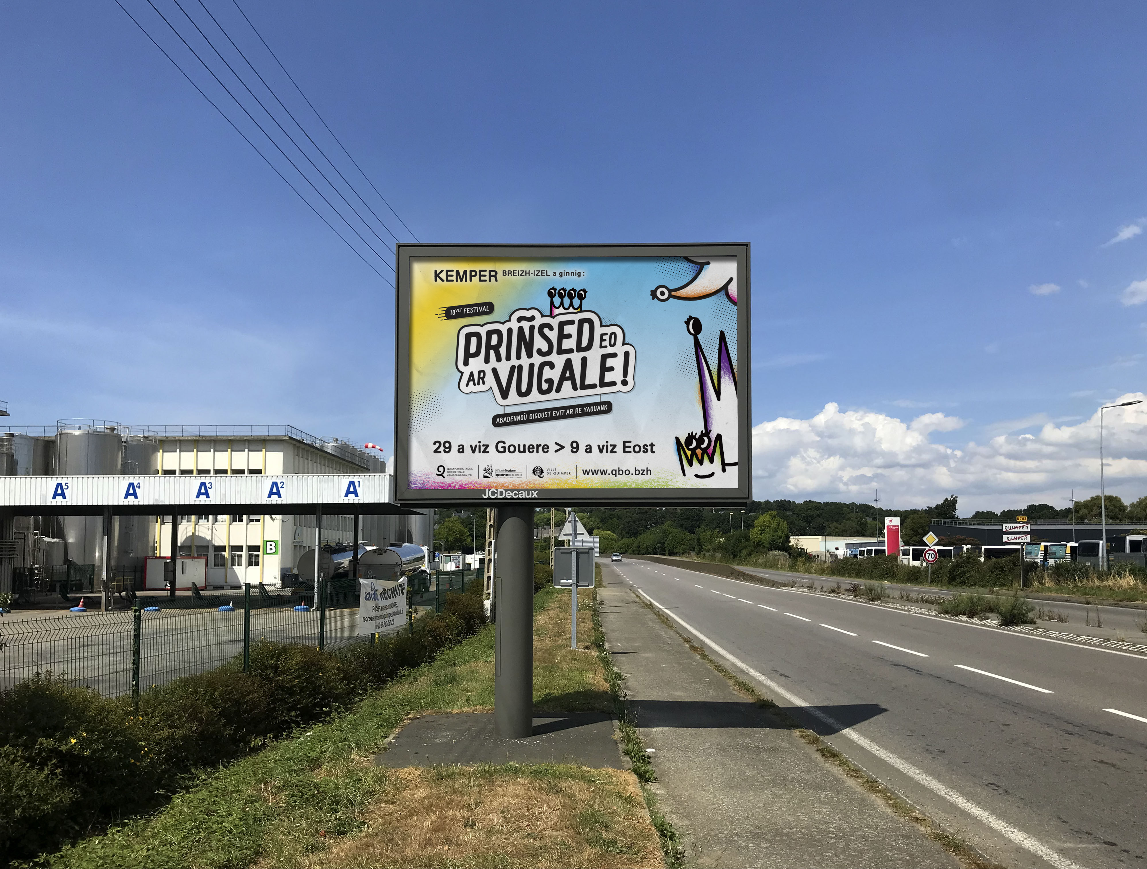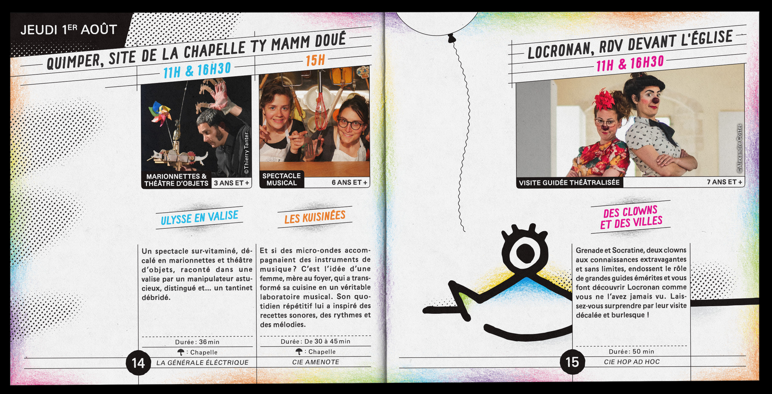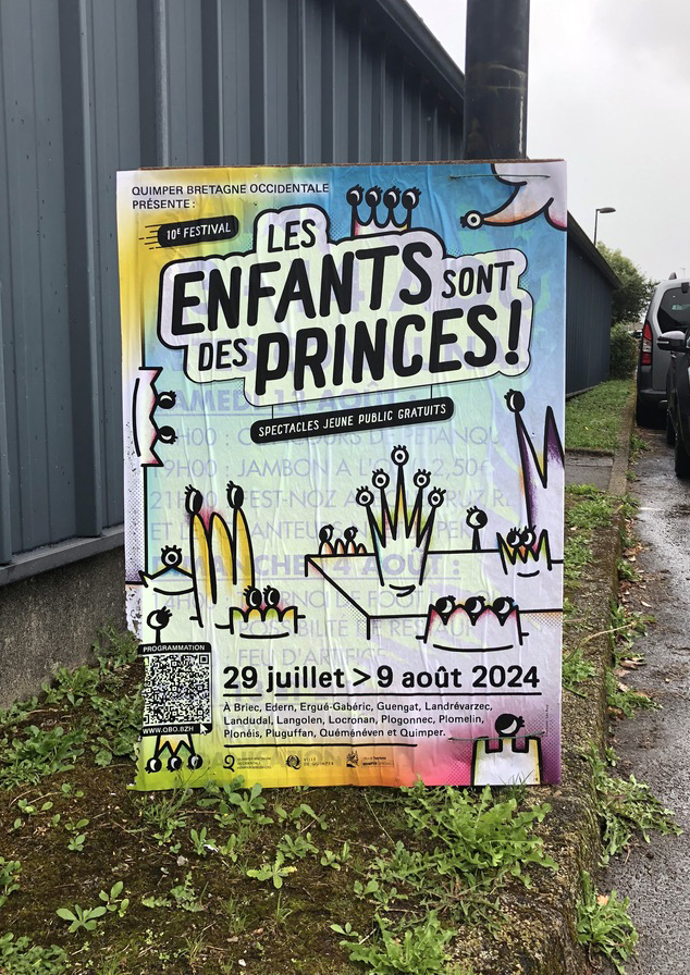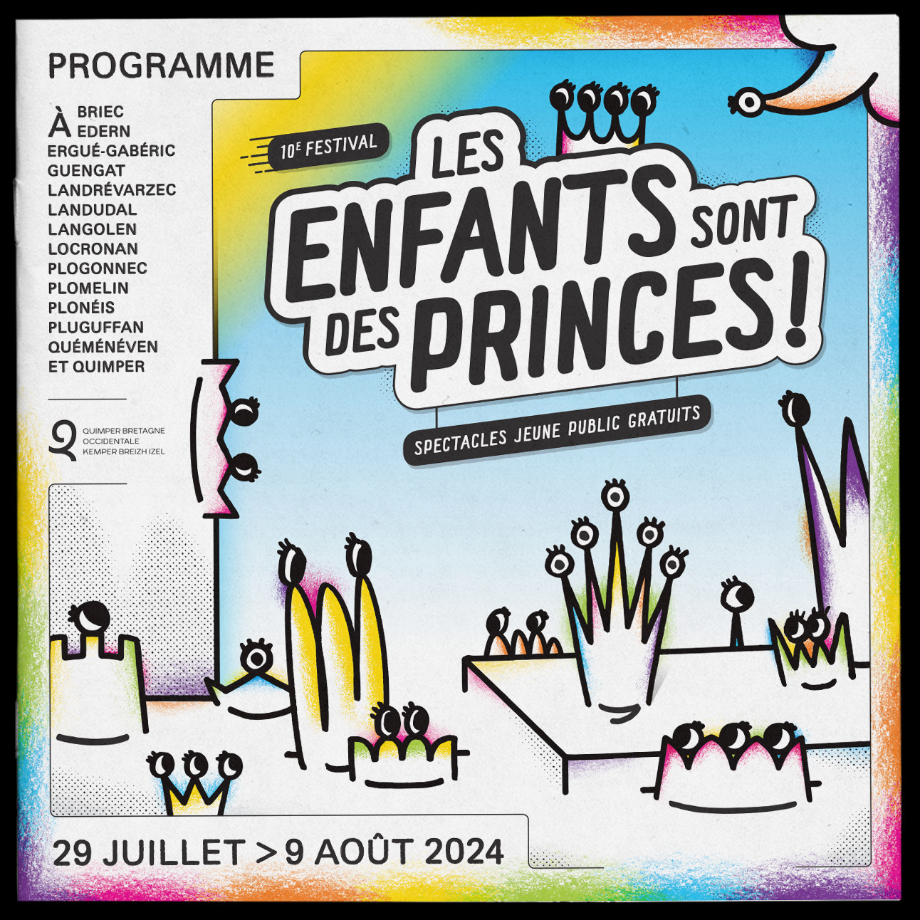 Les Enfants sont des Princes est un festival d'arts du spectacle pour enfants qui se déroule à Quimper (FR). Pour célébrer la 10e édition du festival, et le fait qu'il se déroule pour la première fois dans les 14 communes de l'agglomération, j'ai créé 8 nouvelles mascottes. Ainsi, chaque commune a son propre personnage. L'affiche de cette édition rassemble donc toutes les mascottes dans une seule illustration, prêtes à faire la fête en assistant aux performances des unes et des autres!