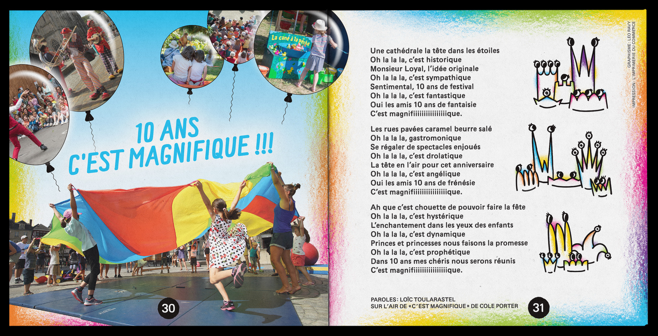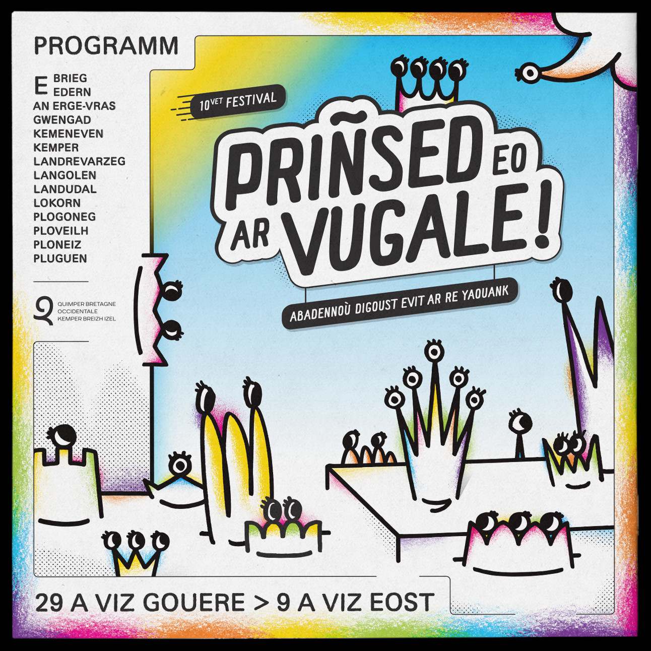 Les Enfants sont des Princes (Kids are Princes) is a performing arts festival for kids taking place in Quimper (FR). To celebrate the 10th edition of the festival, and the fact that it is happening for the first time in all 14 municipalities of the agglomeration, I created 8 new mascots. This way, each municipality has their own character. The poster of this edition therefore gathers all the mascots in one illustration, ready to celebrate by attending each other's performances!